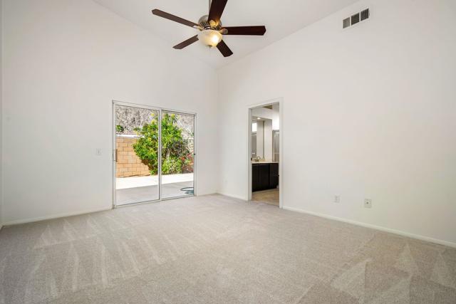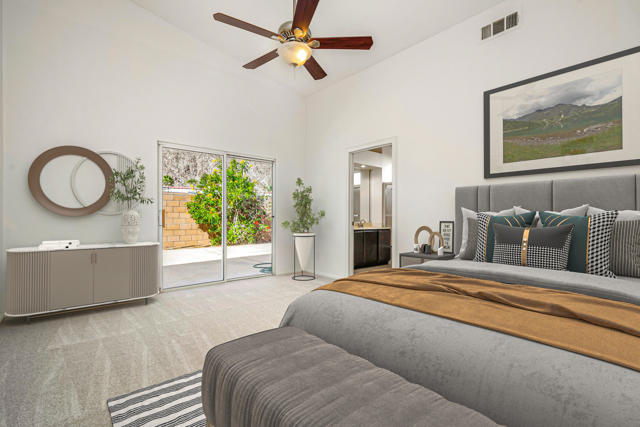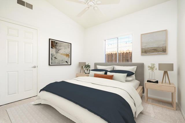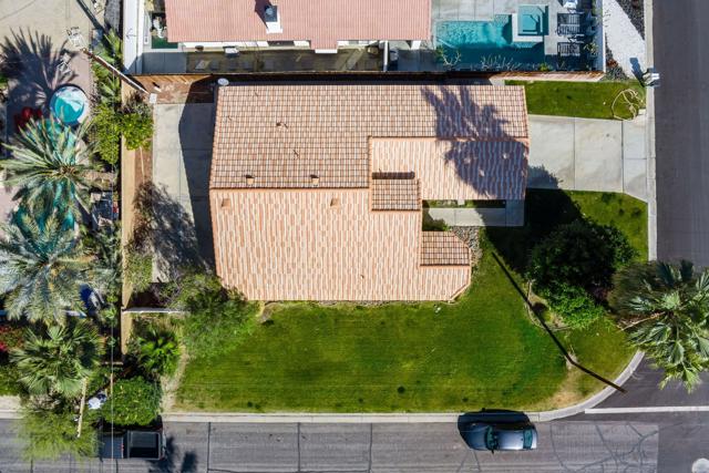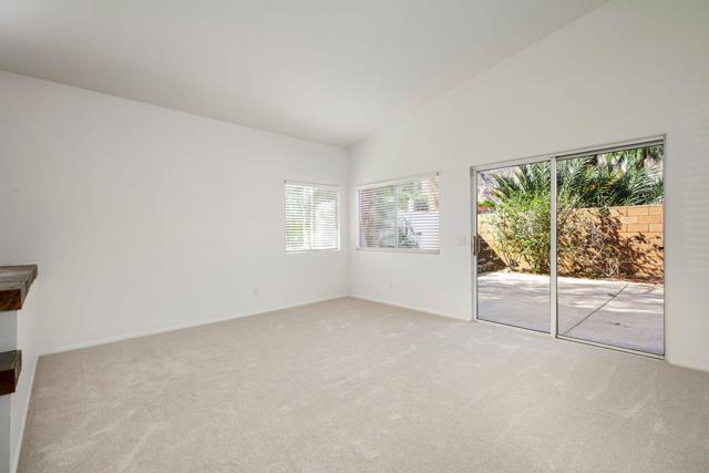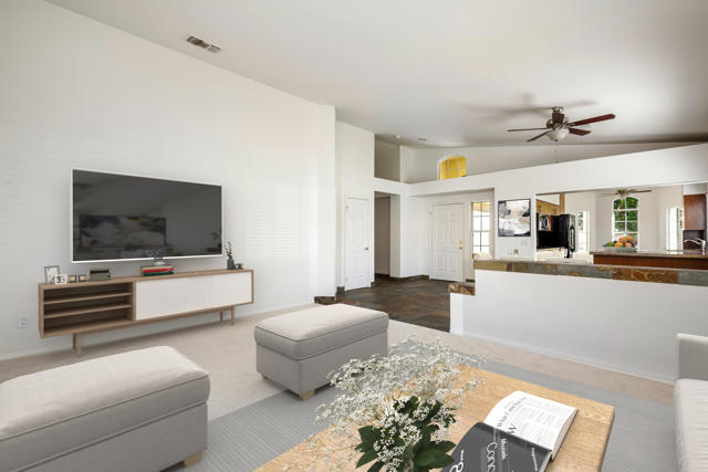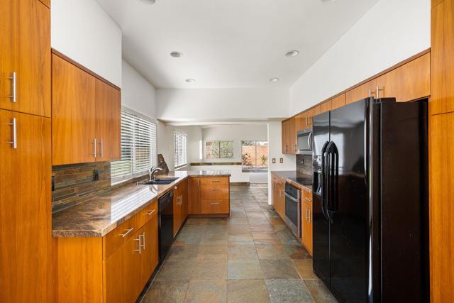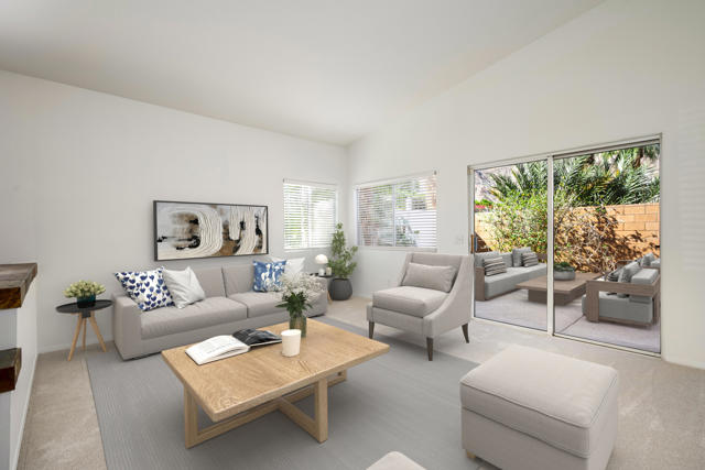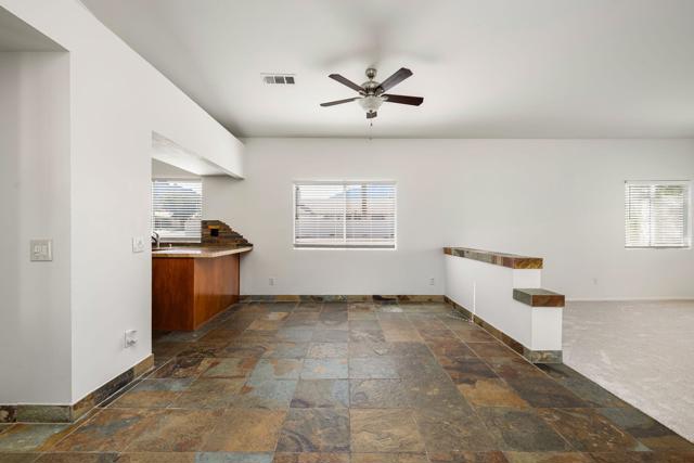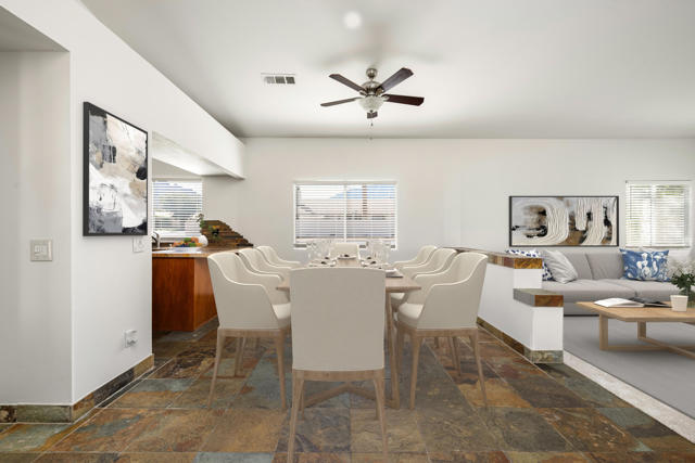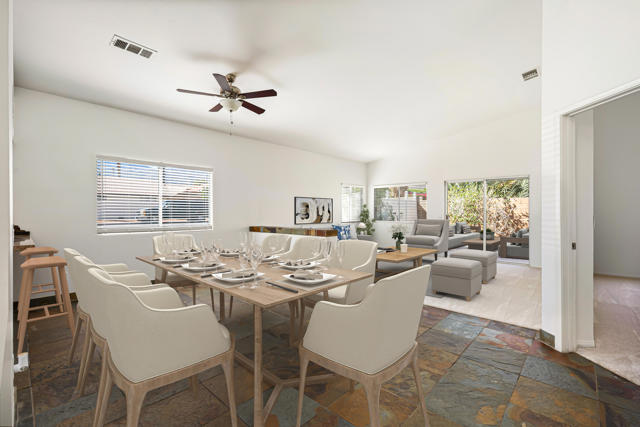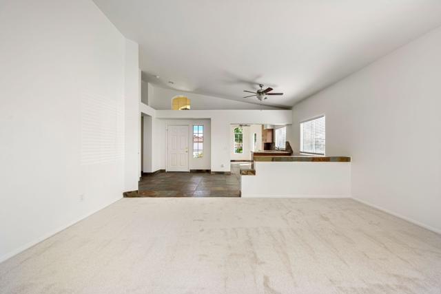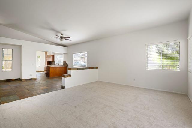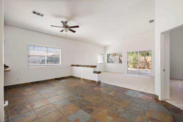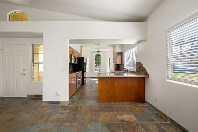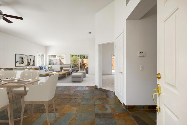 Situated on an elevated corner lot in the desirable La Quinta Cove, this beautifully appointed single-family home offers expansive west-facing panoramic mountain and sunset views along with 1,529 square feet of thoughtfully designed living space featuring 3 bedrooms and 2 bathrooms. The welcoming entry showcases elegant slate tile flooring and designer accents that flow into a spacious great room with vaulted ceilings, creating an open and airy feel, while a tasteful pony wall subtly separates the dining area. The upgraded kitchen features granite countertops, abundant cabinetry with brushed nickel hardware, a custom backsplash, built-in microwave and oven, and a bright breakfast nook alcove perfect for morning coffee. Additional enhancements include recessed lighting, sliding glass doors that bring in natural light, custom wall coverings, and window treatments. The guest bathroom features an impressive floor-to-ceiling slate tile shower surround, adding a spa-like touch. The primary suite offers dual vanities, a shower-over-tub layout, and a walk-in closet, while a dedicated laundry room with 220-volt service adds everyday convenience. Located just minutes from Old Town La Quinta's popular restaurants, boutique shops, farmers market, and scenic hiking and biking trails, this home offers the perfect combination of stylish upgrades, comfortable living, and the best of the La Quinta Cove lifestyle.
