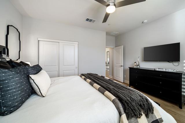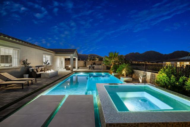 Set against the iconic silhouette of the Santa Rosa and Coral Mountains, this stunning residence in the coveted Cantera at Coral Mountain community delivers a rare blend of elegance, resort-caliber outdoor living, and an unmatched La Quinta address just outside the gates of PGA West and The Quarry. From the moment the twilight-lit palms and paver driveway come into view, it is clear this property was designed for those who expect more.Spanning over 3,000 square feet, the thoughtfully designed floor plan offers three bedrooms plus a versatile bonus room ideal as a fourth bedroom, home office, den, or game room. The grand open-concept interior flows seamlessly from the chef's kitchen through the great room and out to the backyard oasis, with expansive sliding glass doors that dissolve the line between indoor comfort and outdoor living. The kitchen is a true showstopper, anchored by an oversized island with quartz countertops, a herringbone tile backsplash, double wall ovens, stainless French door refrigerator, and a sculptural geometric pendant chandelier that commands attention.The primary suite is a private retreat, featuring a dramatic board-and-batten accent wall and a barn door entry to the spa-like bathroom, adding character and function. Generous second and third bedroom suites provide comfortable separation for guests or multigenerational living.Outside, the backyard rivals any five-star resort. A sparkling pool with an oversized tanning shelf, infinity-edge spa, and sweeping mountain views creates the ultimate desert escape. The entertainer's patio features an outdoor kitchen with stone countertops, covered dining, a fire pit lounge, an artificial turf putting course, and mature palms framing every angle. Solar panels add long-term value and energy efficiency. Low HOA. Schedule your private showing today and experience everything this La Quinta gem has to offer.