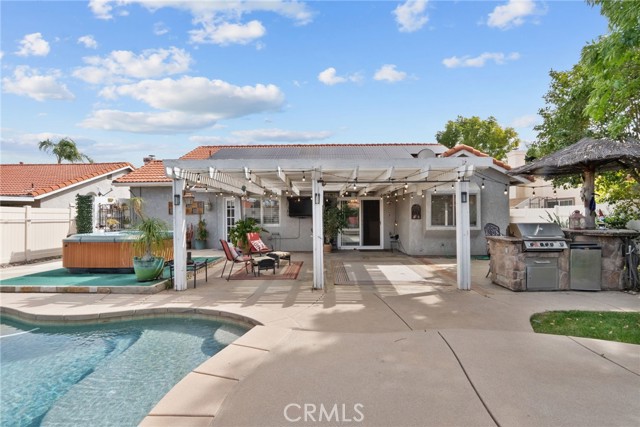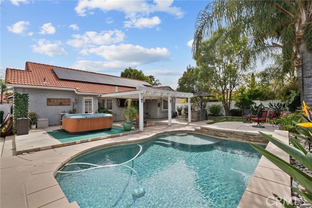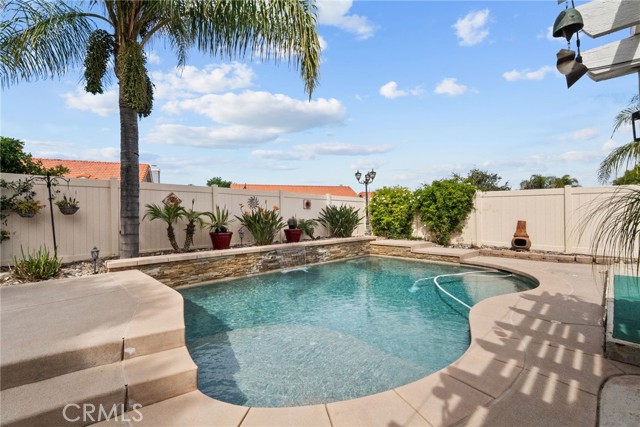 Welcome to this move-in ready gem offering 1,323 square feet of thoughtfully designed living space on an expansive 7,405 square foot lot in a quiet, established neighborhood. Built in 1988, this home features vaulted ceilings in the living area that create an open, airy feel filled with natural light. The functional layout includes a charming breakfast nook and beautifully updated bathrooms that add a modern touch. Step outside and experience true Southern California living. The spacious backyard is designed for entertaining, complete with a sparkling pool, jacuzzi, built-in BBQ, and a shaded patio perfect for relaxing on warm afternoons. A shady front porch adds even more inviting outdoor space. Additional upgrades include epoxy garage floors, vinyl fencing, leased solar for energy efficiency, newer HVAC, and a newer water heater — giving you comfort and peace of mind. Located close to shopping, schools, and dining, this home offers convenience without sacrificing tranquility. No HOA and situated in a low tax area. This is the kind of property buyers wait for — well-maintained, upgraded, and ready to enjoy.