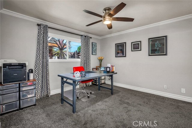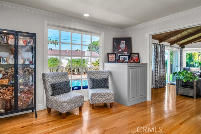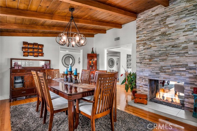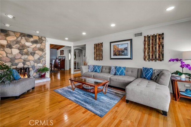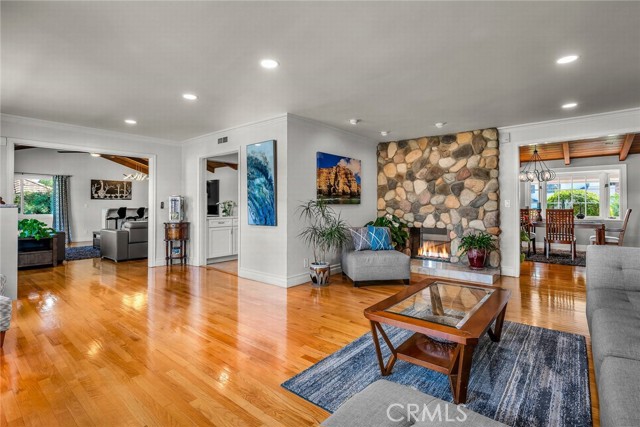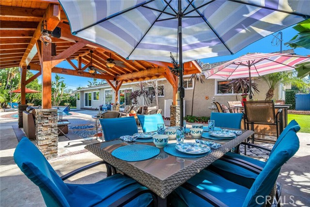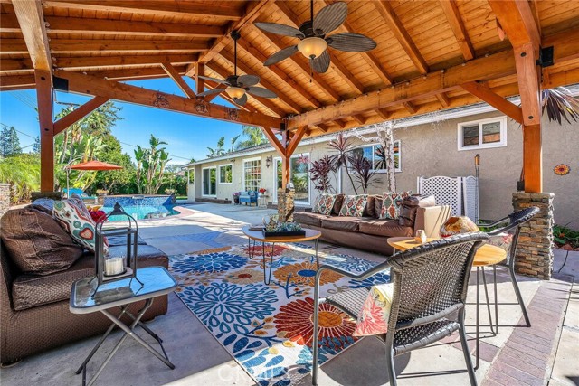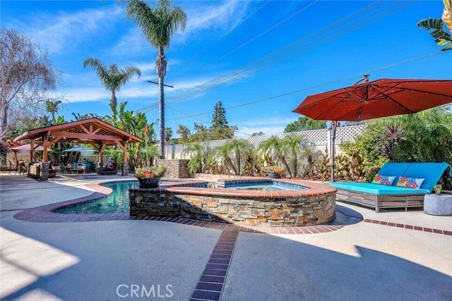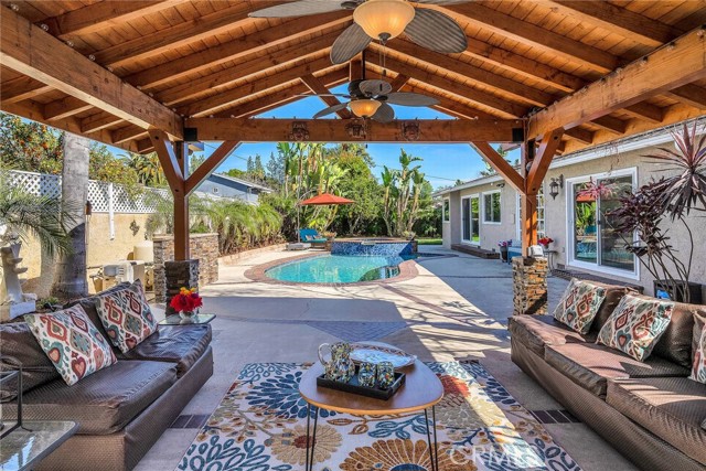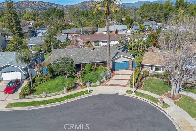 A Rare Single-Story Offering on a Quiet West Hills Cul-de-Sac. This beautifully updated home blends timeless design, thoughtful craftsmanship, and seamless indoor-outdoor living. Custom stonework, manicured landscaping, and classic brick detailing create exceptional curb appeal and a memorable first impression. Double doors open to a bright, open floor plan designed for refined living and effortless entertaining. The formal living room features rich hardwood floors, floor-to-ceiling picture window, stone fireplace, recessed lighting, and sliding doors framing backyard views. An expansive family/media room showcases vaulted wood-beam ceilings, walls of windows, statement fan, wet bar, and direct outdoor access. At the heart of the home, the remodeled chef’s kitchen flows into the living, dining, and family spaces and features ceiling-height cabinetry, quartz countertops, stainless steel appliances, and generous center island. Just beyond the kitchen are a spacious laundry room, expansive pantry, and remodeled guest bath for convenience. The adjacent dining room offers dramatic wood-beam ceilings, decorative lighting, and dual bay windows filled with natural light. The private primary suite serves as a true retreat with walk-in closet and custom built-ins. The spa-inspired ensuite bath includes jetted soaking tub, oversized step-in shower, dual-sink vanity, and frosted window. French doors open to a secluded patio with fountain, creating a peaceful escape. Two additional generously sized bedrooms and an updated hall bath complete the interior. Designed for year-round enjoyment, the backyard delivers a resort-style experience. Lush landscaping surrounds a sparkling pebble-finish pool and raised spa with waterfall. A custom covered pavilion with vaulted timber ceiling, fans, and lighting creates an inviting outdoor living room, while a generous grassy area provides space for entertaining or play. Additional highlights include an attached two-car garage with built-in storage, insulated door, and separate ductless mini-split HVAC system—ideal for a gym or workshop. The home also features central HVAC, copper plumbing, a 200-amp electrical panel, tankless water heater with circulating pump, and dual-pane windows. Award-winning schools: El Camino Real, Chaminade, Hale, and Pomelo. Single-story cul-de-sac homes with this level of upgrades, privacy, and resort-caliber outdoor living rarely become available in West Hills and tend to attract strong early interest.