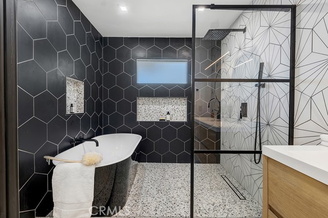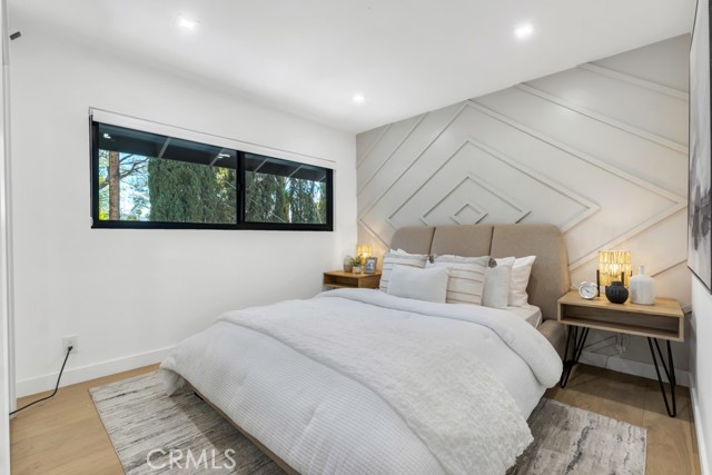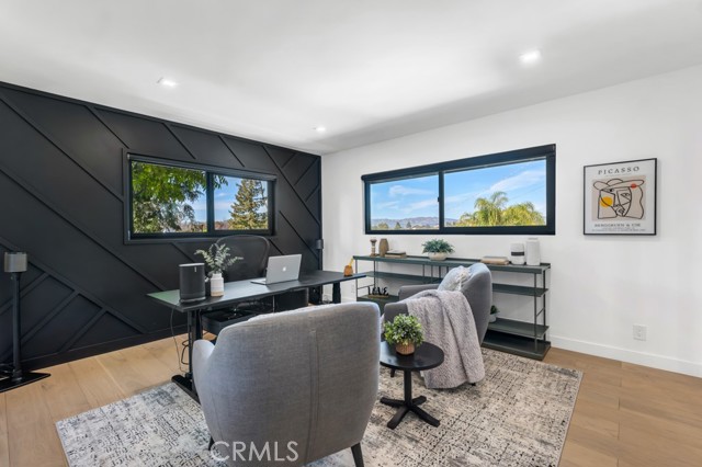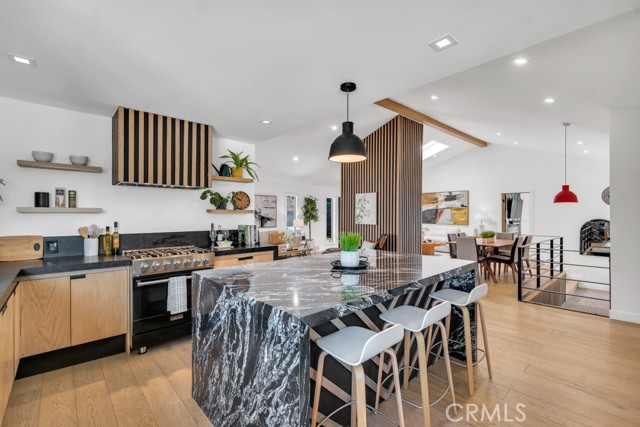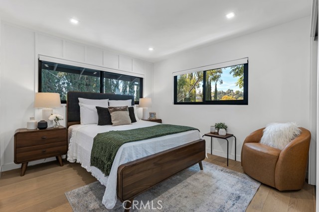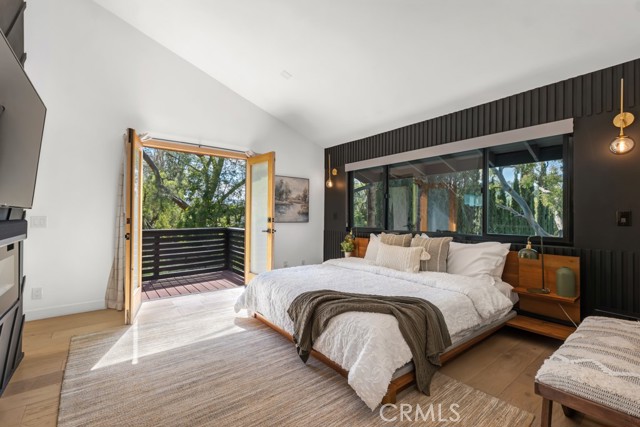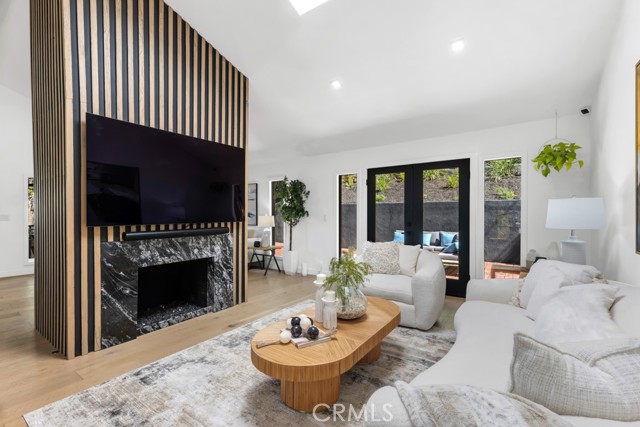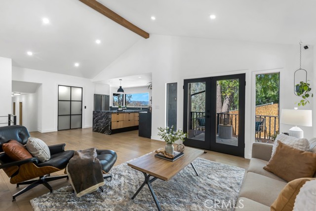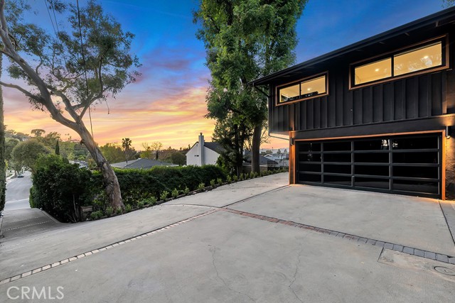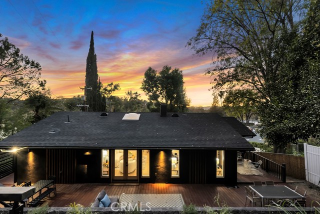 Ideally tucked away at the end of a private flag lot, this reimagined and ultra sleek Mid-Century Modern masterpiece is a true architectural statement. An industrial iron-and-glass double-door entry reveals a light-drenched, open-concept interior defined by soaring double-height vaulted ceilings and exquisite wide-plank flooring throughout. The chef’s kitchen has epic panoramic views and serves as the home’s centerpiece, anchored by a massive single island with imported Brazilian quartzite countertops, professional-grade Viking appliances, and a spacious walk-in pantry. Framed by expansive windows and multiple sets of French doors, the living space offers a seamless indoor-outdoor flow to wrap-around decks and a flat lounging pad. The backyard is a private sanctuary, featuring a romantic covered sitting area perfectly that is perfectly positioned to capture breathtaking daily sunsets. Set on a rare 13,969-square-foot lot that, the property offers unparalleled privacy, exclusivity, and space. Complete with a luxurious oversized primary suite with a gorgeously updated ensuite bathroom, and its own private viewing balcony. Located just walking distance from Ventura Boulevard with all of the community's vast amenities, this home is ideal for elite and luxurious living.