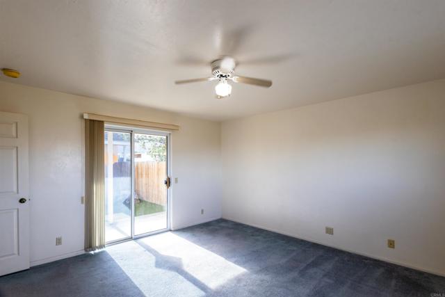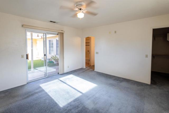 2 bedroom, 2 bath home featuring a welcoming foyer entry with a thoughtfully designed split-bedroom layout and each bedroom privately situated on either side of the home. Both spacious bedrooms offer sliding glass doors that open directly to a serene back courtyard, creating seamless indoor-outdoor living. The main living area boasts vaulted ceilings that enhance the open, airy feel, while a cozy fireplace serves as the focal point of the living room. Enjoy energy efficiency and long-term savings with owned solar. This home blends comfort, privacy, and functionality.
