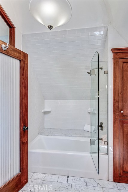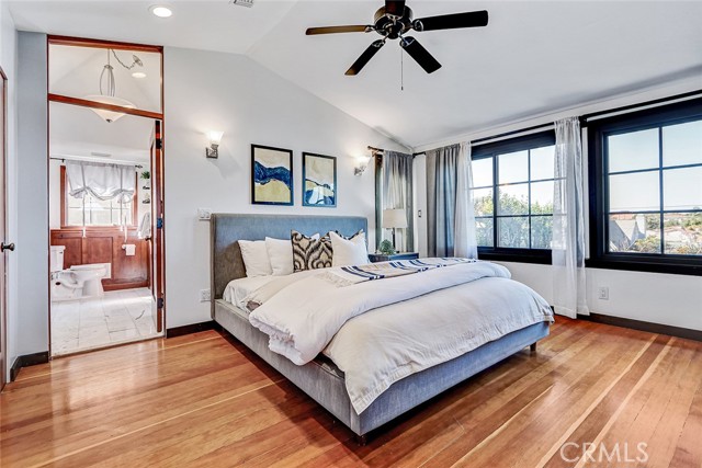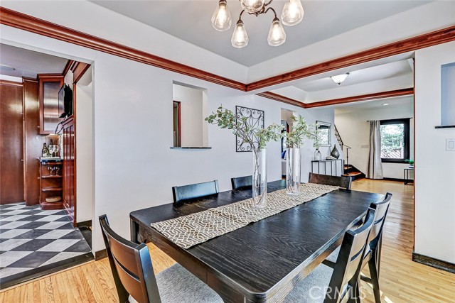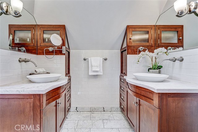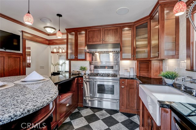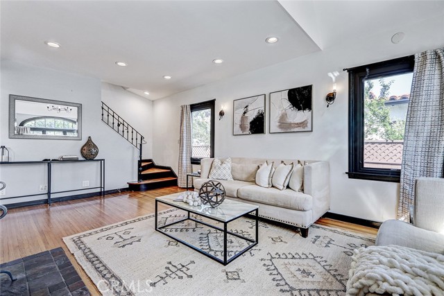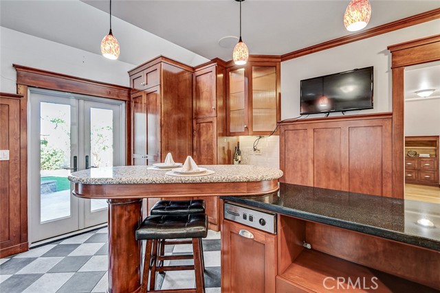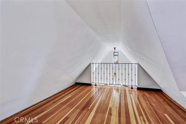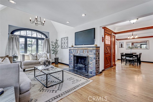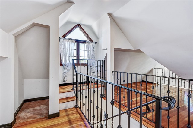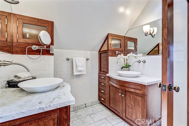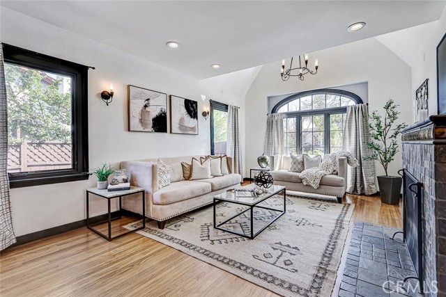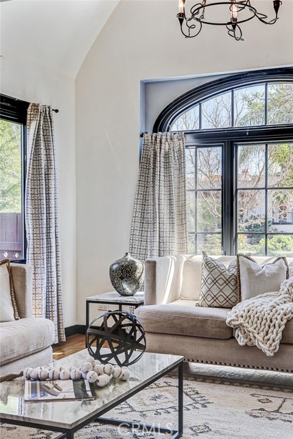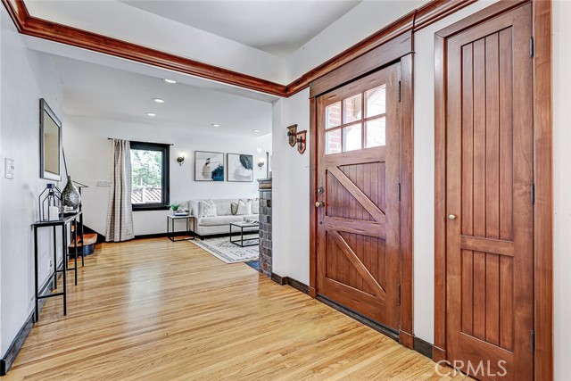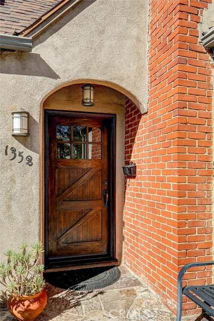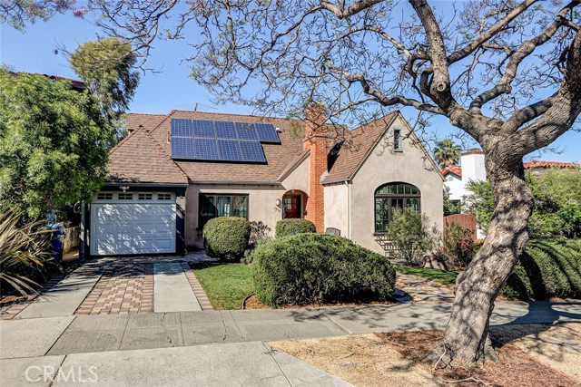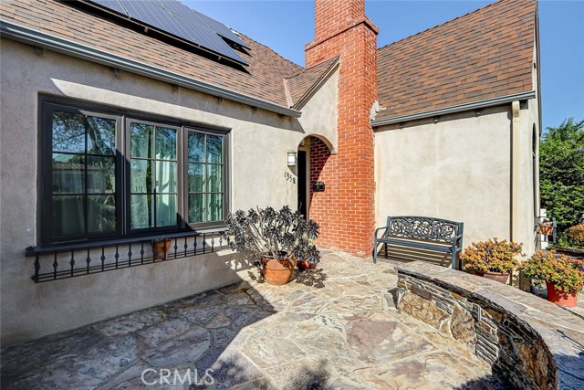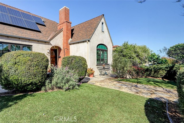 Elegant Tudor charm meets thoughtful modern design in this beautifully remodeled residence. Vaulted ceilings span the living room, kitchen, stairwell, loft, and spacious primary suite, creating an open, light-filled feel throughout. The gourmet kitchen features a stainless steel range hood, dual-level contrasting granite counters, fluted glass cabinet doors, skylights, and layered task and accent lighting. A cozy loft reclaimed from the attic provides a unique retreat, while the primary suite showcases custom closet and bath cabinetry crafted from reclaimed wood. Natural wood and stone details add warmth throughout, complemented by a central vacuum system and sound with in-ceiling speakers. Recent upgrades include solar panels and new windows, enhancing both efficiency and comfort. The exceptionally large yard offers established vegetable, herb, and flower gardens, along with mature grapevines and a curated collection of fruit trees, including pomegranate, macadamia, guava pineapple, and apricot—creating a lush and productive outdoor escape.