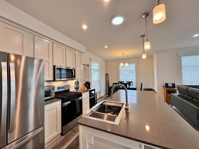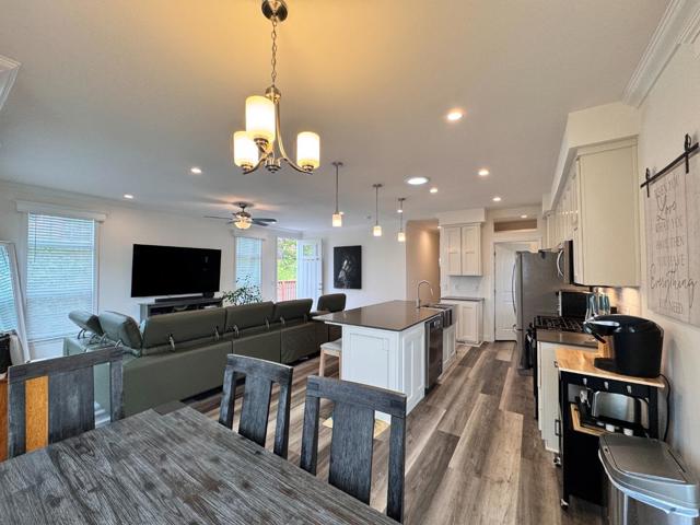 Welcome to this newer (2024) corner home on an interior street. At the entrance you'll find a large Trex deck with enough space for a table and chairs to enjoy the sunshine. Upon entry, you're greeted with 9ft ceilings, recessed lighting, crown molding throughout, wide plank, waterproof LVP flooring, open-concept kitchen, dining area & living room with enough space for all your entertaining needs. The kitchen is equipped with stainless steel appliances, shaker cabinetry with under cabinet lighting, the sink is conveniently located in the over-sized quartz island, w/ laundry just off kitchen; a side door leads to an extended carport. The bedrooms all have generously sized closets, ceiling fans and well positioned windows offering lots of natural sunlight. The Primary bedroom is a true homeowner's oasis with walk-in closet, coffered ceilings with dimmable light/ceiling fan and high windows. Barn doors lead you to the spa bathroom - a true oasis with an over-sized jet tub with larger shower, double vanity and water closet. Guest bath offers a tub/shower with stylish rolling glass doors and large vanity for additional storage. Outside offers wrap around fencing, a hardscape side yard area for fire pit and socializing, an over-sized 8x14ft Tuff Shed and room to meet all your needs.