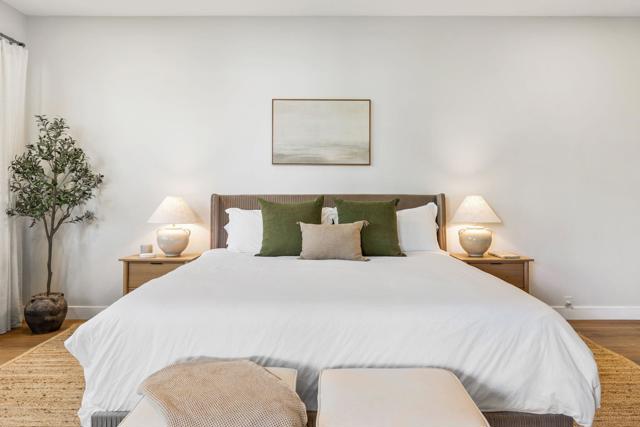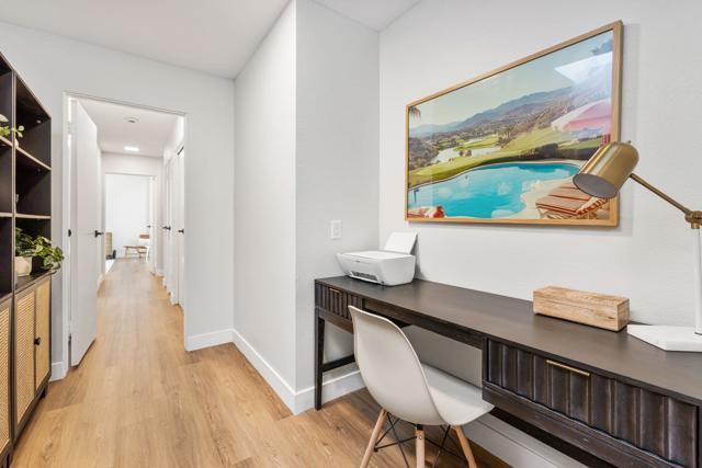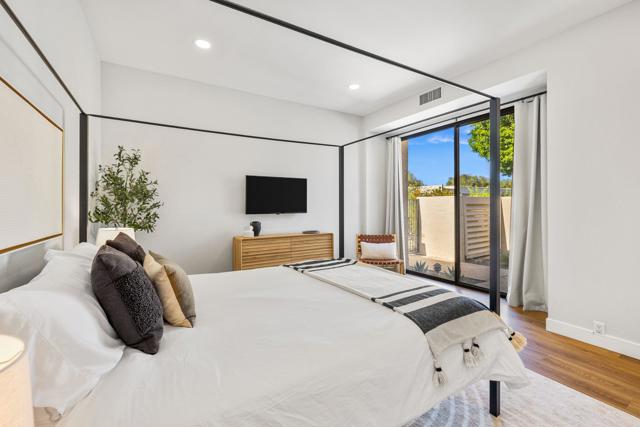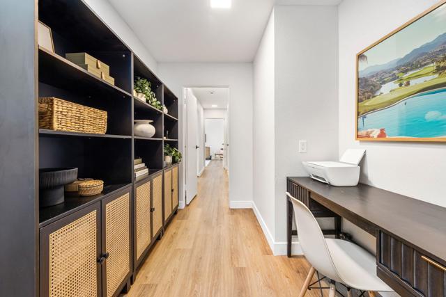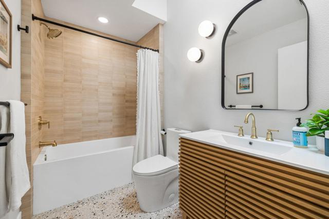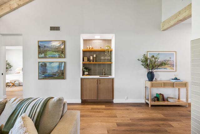 Completely redesigned by a leading Los Angeles design team, this 2-bedroom residence in Mission Hills Country Club offers a level of finish and detail that sets it apart. Warm finishes and a strong indoor-outdoor connection define the space. The living room features vaulted wood-beamed ceilings, a tiled fireplace, and a custom built-in wet bar. Large sliders open to a covered patio just steps from the community pool and spa, creating a setting that lives like a private extension of the home. The kitchen pairs clean design with quality materials, including white oak soft-close cabinetry, brass hardware, quartz countertops, stainless steel appliances, and an island suited for dining and entertaining. The dining area opens to a front patio with mountain views. The primary suite includes direct access to the back patio and a redesigned bathroom with floor-to-ceiling textured tile, dual vanities, and a walk-in shower. A reconfigured layout adds a bonus area off the suite, suitable for a sitting space, office, or reading nook. The guest bedroom also opens to the patio and is served by an updated hall bath with a soaking tub, glazed ceramic tile, and terrazzo-inspired flooring. Additional features include dimmable lighting, a laundry closet, ample storage, and a private two-car garage with dedicated golf cart space. The HOA covers Spectrum cable and internet, landscaping, trash, community pools, and roof and stucco maintenance. The land lease extends through 2121. A membership at Mission Hills Country Club offers access to three golf courses, tennis and pickleball courts, croquet lawns, fitness facilities, and multiple dining venues. Located minutes from shopping, dining, and hiking, with close proximity to El Paseo, downtown Palm Springs, and The Palm Springs International Airport. Don't miss out on this opportunity to make this property yours.