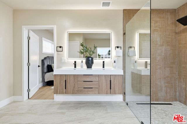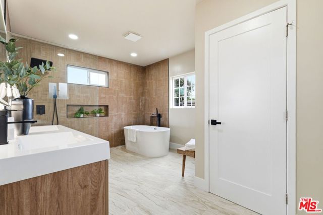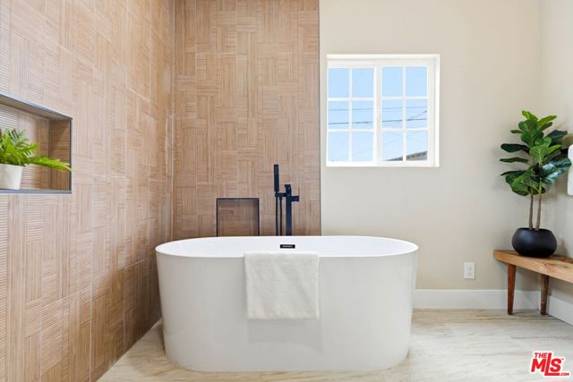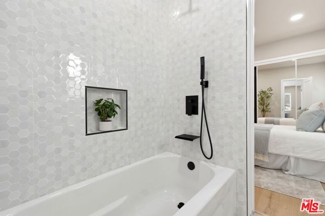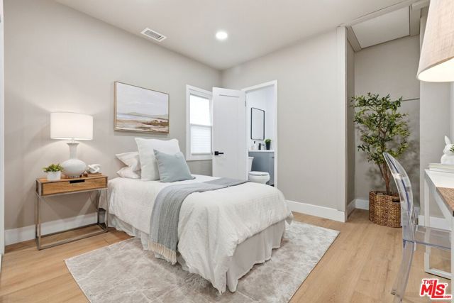 Welcome to an exceptional, fully reimagined residence in one of Los Angeles' most coveted neighborhoods. This designer-renovated home seamlessly blends modern sophistication with timeless architectural charm, delivering a truly elevated living experience. Every inch of this home has been meticulously curated with premium finishes and thoughtful design. Flooded with natural light, the interior showcases an effortless flow, enhanced by new dual-pane windows and refined details throughout. The formal living room is both elegant and inviting, anchored by a statement fireplace with custom built-ins, creating the perfect setting for intimate gatherings or relaxed evenings.Designed to impress, the gourmet kitchen is a true centerpiece featuring custom oak cabinetry, sleek quartz countertops, and a seamless integration of function and style. The adjacent dining area opens beautifully to the outdoors, embodying the best of California's indoor-outdoor lifestyle. The primary suite is a private sanctuary, offering a spa-inspired retreat with a luxurious en-suite bathroom complete with a walk-in shower, soaking tub, and striking designer finishes- not to mention built in walk in closet! Additional bedrooms are generously sized and complemented by tastefully appointed bathrooms that echo the home's cohesive, upscale aesthetic. Step outside to a serene and private backyard oasis ideal for entertaining, unwinding, or expanding with a future ADU. The outdoor space offers endless potential while maintaining a sense of tranquility and exclusivity. Notable upgrades include new dual-pane windows, updated electrical, tankless water heater, upgraded luxury vinyl flooring, recessed lighting, fresh interior and exterior paint, and a finished attic space perfect for a private office, media lounge, or additional guest quarters. A rare offering that embodies style, comfort, and sophistication all in a prime Los Angeles location. This is a must see. Not to be missed.