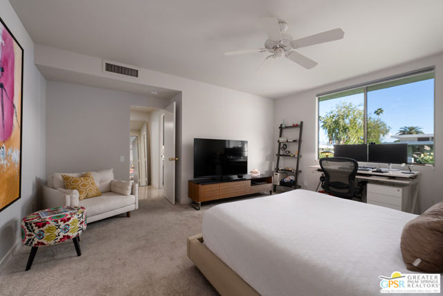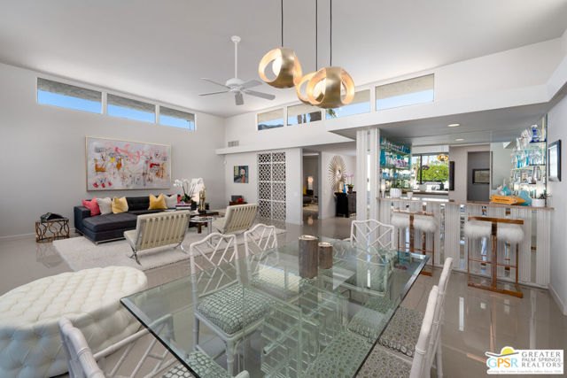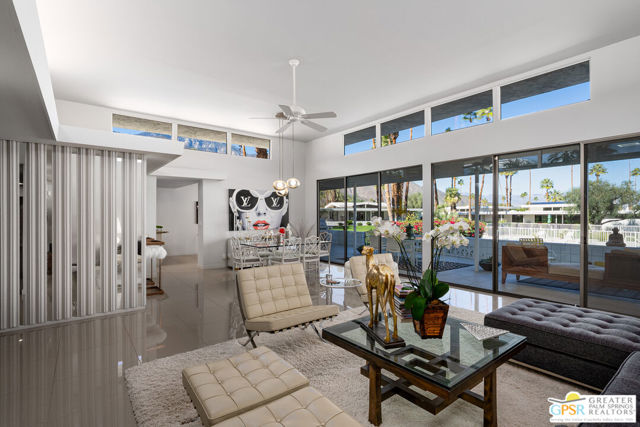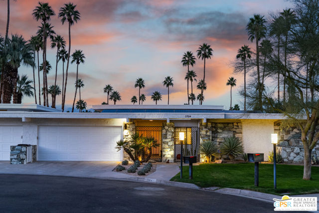 Discover iconic Palm Springs living in this striking Charles Du Bois residence, tucked at the end of a quiet cul-de-sac in sought-after Canyon Estates (on Fee Land)! Elevated to capture even more expansive valley and mountain views, the home's unique orientation maximizes both beauty and efficiency - southern exposure powers the solar panels, while the north-facing patio stays shaded all day for effortless outdoor living. Classic desert modern design shines through with clerestory windows, clean lines, and walls of glass that blur indoor and outdoor spaces. The flexible layout offers two spacious suites plus a stylish den or office, while the open living area, complete with wet bar, flows seamlessly to the expansive patio - perfect for entertaining or simply taking in the view! All set within a resort-style community featuring golf, pools, spas, tennis, and more - just minutes from Indian Canyons and downtown Palm Springs.