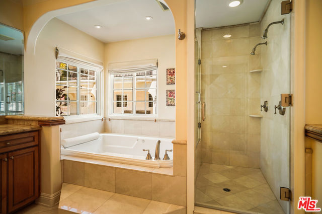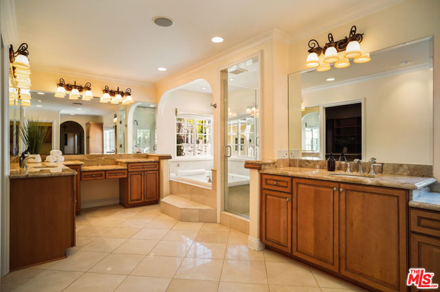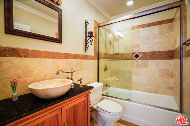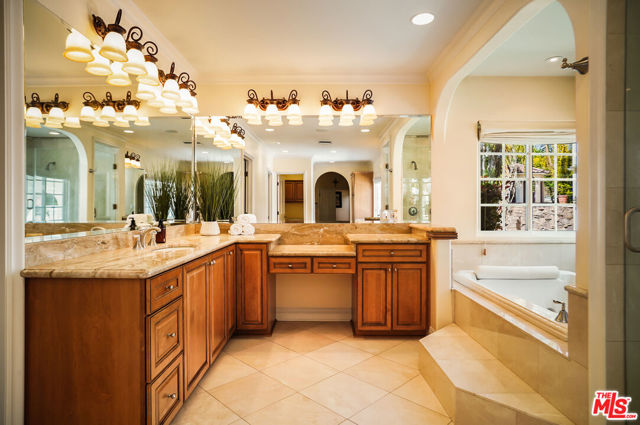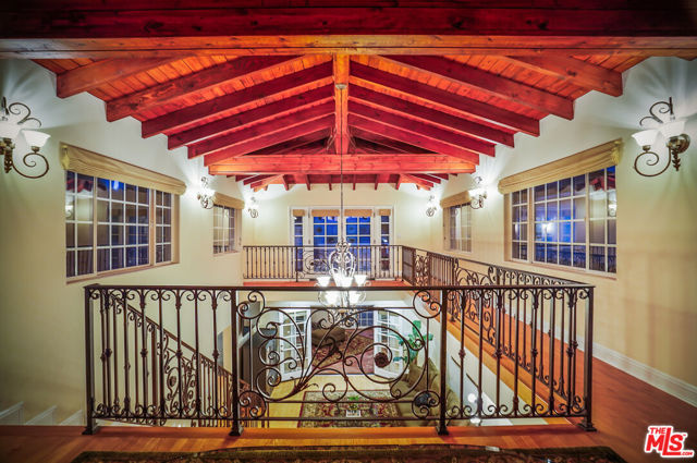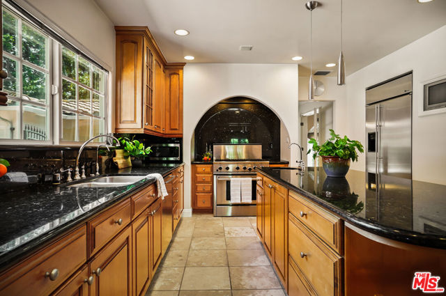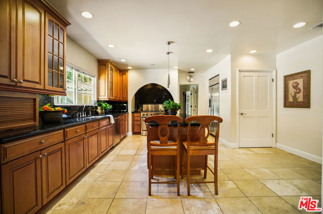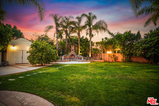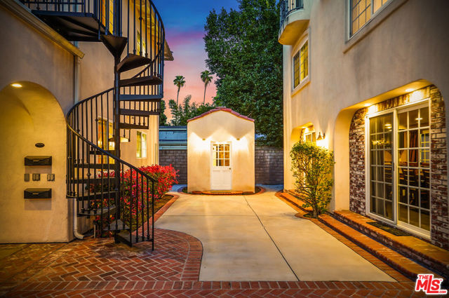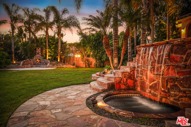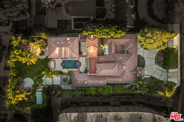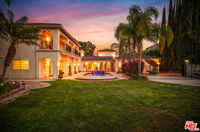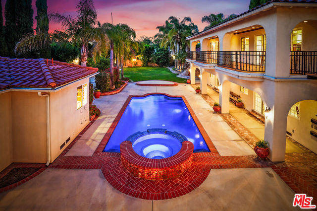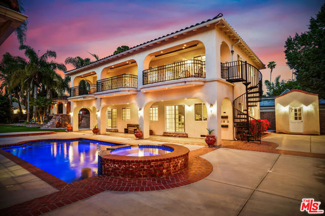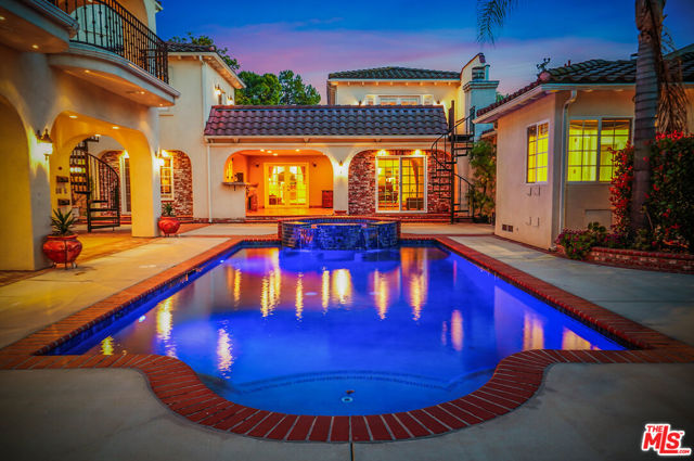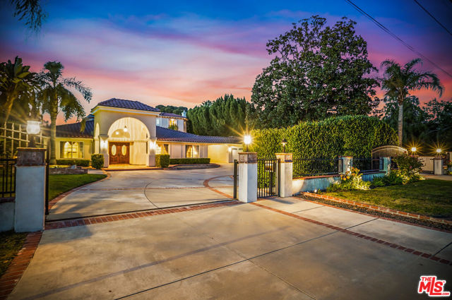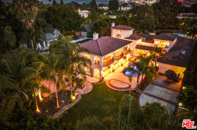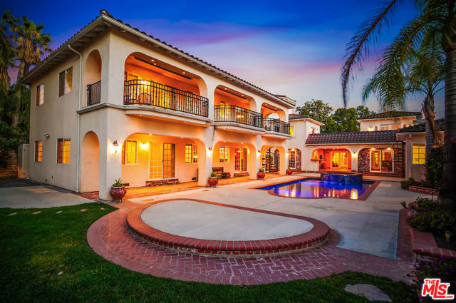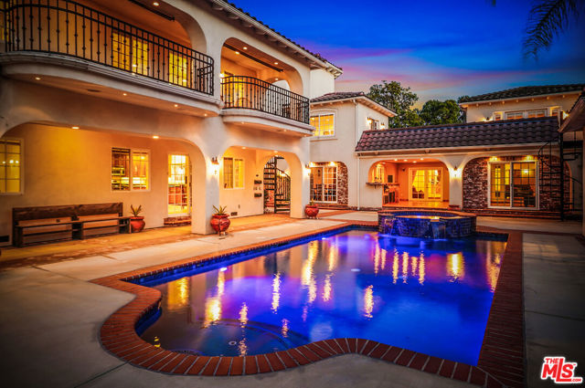 EXQUISITE GATED TOLUCA LAKE COMPOUND ON A RARE, EXPANSIVE FLAT 3/4 ACRE (APX) LOT WITH A GRAND TWO-STORY GUEST HOUSE AND UNMATCHED UPSIDE. A truly exceptional offering in the heart of Toluca Lake, this Spanish-Mediterranean estate with timeless Santa Barbara influence spans approximately 6,100 sq ft (apx) in the main residence, complemented by an extraordinary, fully independent 3,275 sq ft (apx) two-story guest house, creating a one-of-a-kind compound with incredible flexibility and future potential. Set on a rare, sprawling flat 3/4 acre (apx) lot, the property presents a unique opportunity to expand, reimagine, or add additional structures/ADUs, an increasingly valuable asset in this coveted neighborhood. The impressive guest house is a standout feature unto itself, offering two full levels, each with 2 bedrooms, 1 bath, and its own kitchen and laundry. Ideal for multi-generational living, creative workspaces, private offices, or significant income potential. Overlooking the resort-style pool and lush grounds, it lives like its own private residence. The main home blends warmth and sophistication, featuring 5 bedrooms and 5 baths, a dedicated office with a kitchenette, a distinctive turret room with a private entrance, a gym, and a tucked-away theater for a true at-home cinematic experience. A custom "Catio" adds a thoughtful and unique touch for pet lovers. At the heart of the home, the gourmet kitchen features a granite island, premium stainless-steel appliances, and custom maple cabinetry, flowing seamlessly into elegant living and entertaining spaces. The primary suite is a private retreat with dual oversized walk-in closets, Italian marble vanities, and a spa-inspired bath with a jetted tub. The grounds evoke a private resort, with multiple courtyards, an arched rose garden, an elevated gazebo, a tranquil waterfall, a Spanish-style saltwater pool and spa, and a freestanding pool house/bath designed for effortless indoor-outdoor entertaining. Additional highlights include an oversized garage with ample parking, seven fireplaces, copper plumbing, a concrete Spanish tile roof, smooth ceilings, multiple HVAC zones, tankless water heaters, a water filtration system, indoor/outdoor surround sound, Cat 5 wiring, and two large storage structures. Located just moments from Toluca Lake Village, studios, and top dining, this rare flat-lot compound with a substantial guest residence and development potential is a truly irreplaceable offering. Seller financing available. Please inquire.