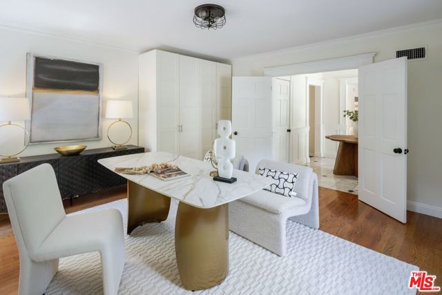 Privately set behind mature landscaping in the coveted flats of Coldwater Canyon, just north of Sunset Boulevard, this timeless Traditional Ranch presents a rare opportunity in Beverly Hills Proper. Originally built in 1948, the home blends classic architecture with thoughtful updates, offering light-filled, well-proportioned interiors designed for effortless single-level living. A charming circular driveway and manicured grounds create standout curb appeal, while inside, elegant formal living and dining rooms, along with a warm family room with fireplace, provide ideal spaces for both entertaining and everyday living. The chef's kitchen features a center island and breakfast nook, while the spacious primary suite is complete with dressing areas and a generous bath. Additional guest bedrooms offer flexibility, and a guest house (504 sf) sits privately at the rear of the property, just beyond the pool, offering a perfect retreat for visitors or additional living space. A quintessential Beverly Hills offering combining charm, comfort, and enduring value.