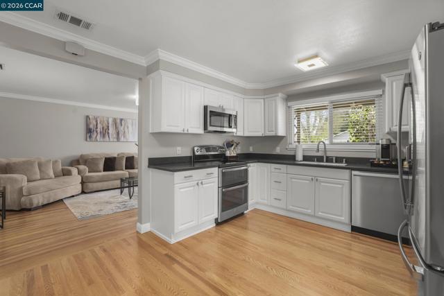 Tucked away in the desirable Vista Diablo neighborhood, this beautifully maintained 3-bedroom, 2-bath home offers comfort, style, and modern efficiency. With approximately 1,266 sq. ft. of living space, it blends thoughtful updates with timeless charm. Step inside to find gleaming hardwood floors throughout the living areas, a cozy wood-burning fireplace, and dual-pane windows that fill the home with natural light. The recently updated kitchen features stone countertops, stainless steel appliances, a free-standing range, and plenty of cabinetry, perfect for cooking and entertaining. Enjoy outdoor living in the beautifully landscaped backyard, complete with a large stamped-concrete patio ideal for relaxing or hosting gatherings. The property also includes RV/boat parking, an owned solar system for energy savings, and a well for irrigation to keep the yard lush year round. Located on a peaceful court, this home offers easy freeway and BART access, making commuting simple while maintaining a quiet suburban feel. Move-in ready and meticulously cared for, this Vista Diablo gem perfectly balances convenience, comfort, and charm. Open House Sat & Sun 1-4p