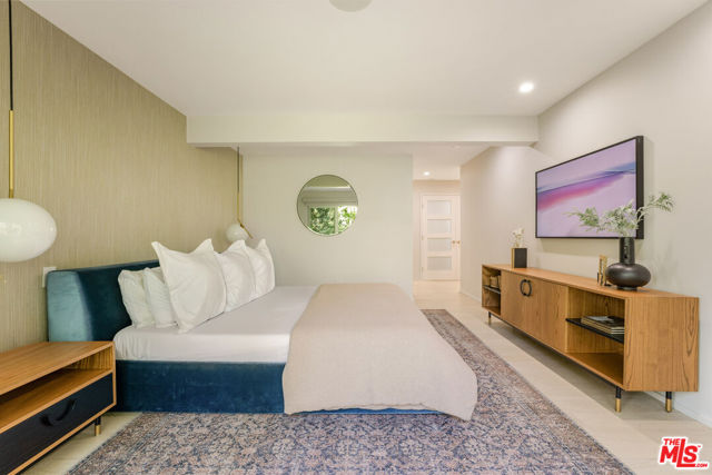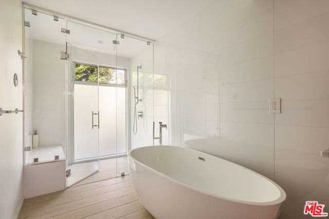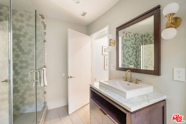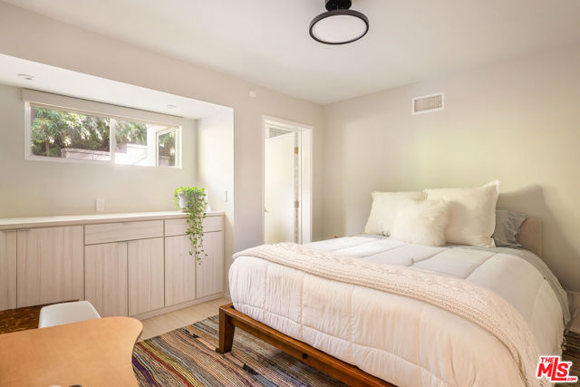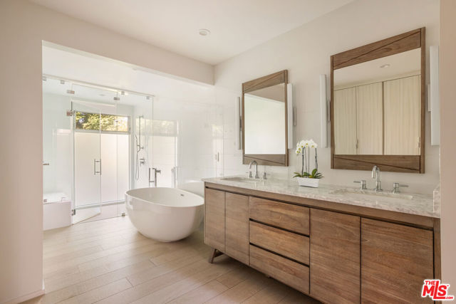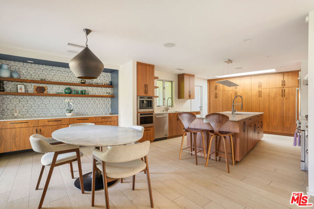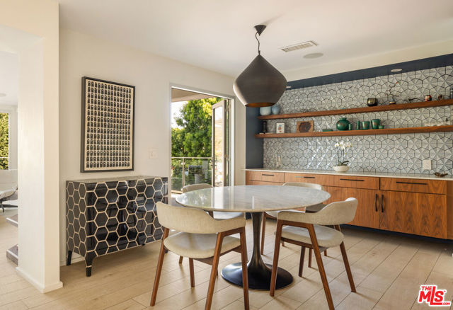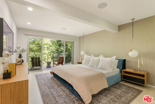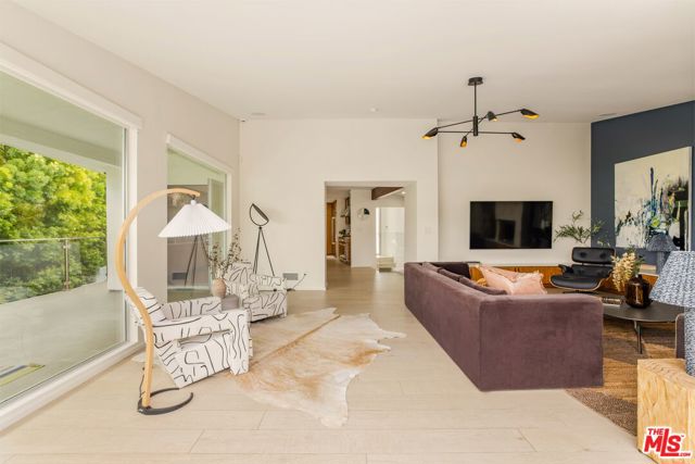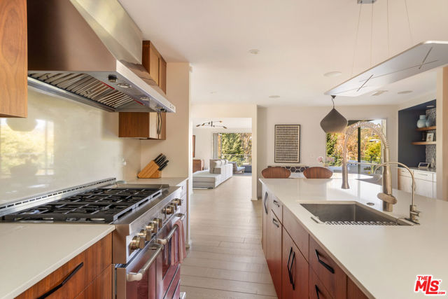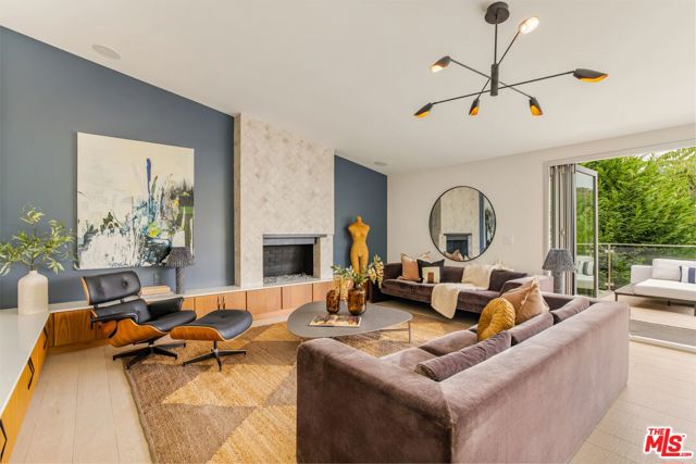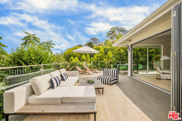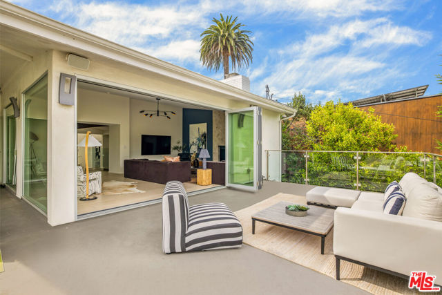 Located in the coveted Santa Monica Canyon, this reimagined coastal contemporary blends mid century character with sleek modern design in one of the Westside's most prestigious enclaves. Designed for seamless indoor outdoor living, it's a home that delivers both everyday comfort and year round entertaining in equal measure. The main level features a dramatic living room with soaring ceilings, a fireplace, custom built cabinetry, a statement fireplace, and walls of glass framing serene treetop and canyon views. Accordion glass doors fold open to create a fluid connection to the outdoors, where expansive decks invite relaxation in the coastal breeze. The open concept kitchen and dining area feature bespoke walnut cabinetry, skylights, built in bar shelving, and top tier stainless steel appliances, skylights, with direct access to an outdoor lounge deck. A full bedroom and bathroom, currently styled as a home office, complete this level. The lower level offers three spacious en suite bedrooms, including a serene primary suite with a private balcony overlooking the grassy yard. The spa inspired bath is appointed with a freestanding tub, walk in shower, and a brand new custom vanity. Two additional suites provide generous accommodations for family or guests. Features & Upgrades include a Whole House Filtration System for pure, clean water throughout, a Battery Backup Power Supply ensuring seamless comfort and security, an EV Charger for effortless electric vehicle convenience, and a two car garage with ample storage. Unmatched access to the best of coastal living: moments to the beach, Ocean Avenue bluffs, and Santa Monica Stairs. Stroll to Montana Avenue boutiques, artisan coffee shops, and award winning dining or head minutes north to Palisades Village and Malibu. The home sits within the highly acclaimed Canyon Charter Elementary School district, in a leafy enclave prized for its walkability, privacy, and sea salt air.