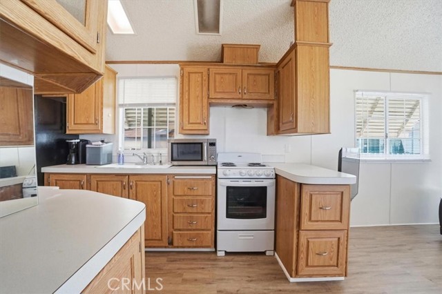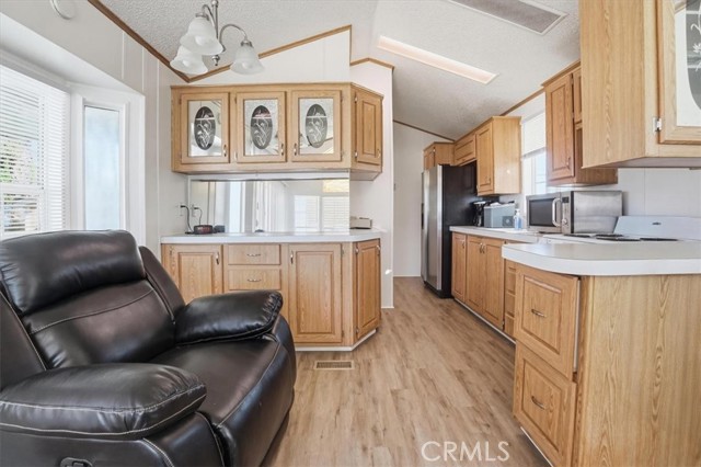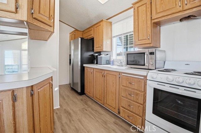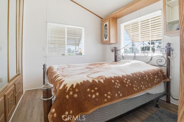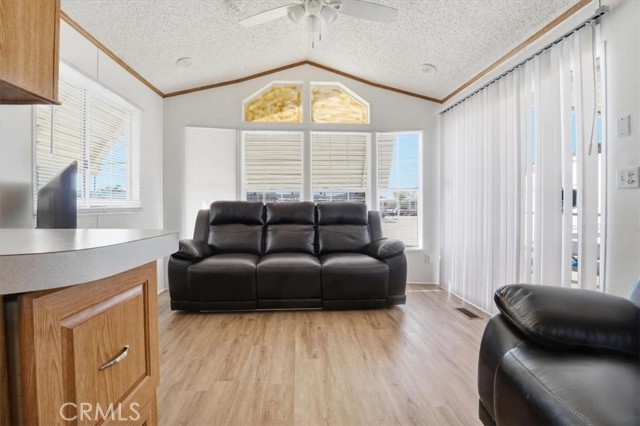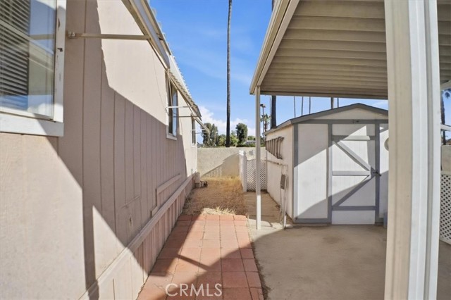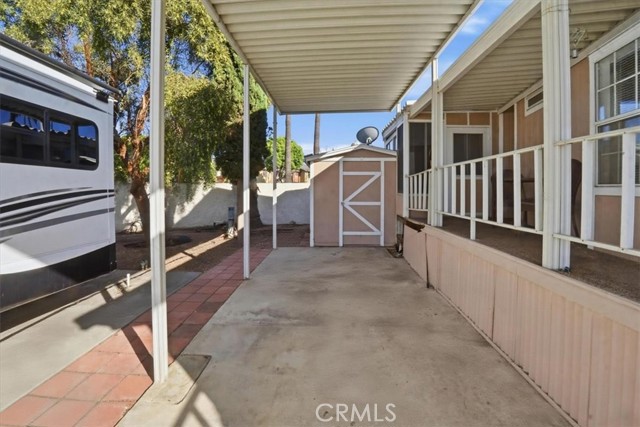 Charming and well-maintained home located in the highly desirable 55+ gated community of Mountain Shadows in Hemet—where you "OWN THE LAND" with no space rent and enjoy a low monthly HOA of approximately $292.00. The HOA includes water, trash, internet, cable, and sewer. This light-filled residence features an open floor plan with vaulted ceilings, abundant natural light, and attractive laminate flooring throughout. The kitchen offers ample cabinetry and a functional layout that opens to the living area, creating a comfortable space for everyday living. The spacious bedroom includes mirrored closet doors and convenient access to the bathroom with a walk-in shower. Enjoy the extended covered patio—perfect for relaxing or entertaining—along with a private yard area, storage shed, and covered carport parking. Mountain Shadows is a gated, resort-style community offering a wide range of amenities including clubhouses, pools and spas, fitness areas, and social activities designed for an active lifestyle. Residents enjoy a peaceful, well-maintained environment with convenient access to shopping, dining, medical services, and everyday essentials. An excellent opportunity for affordable homeownership in a vibrant and welcoming community.