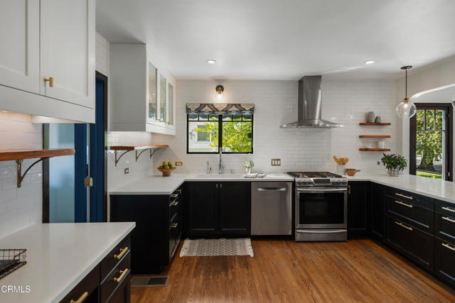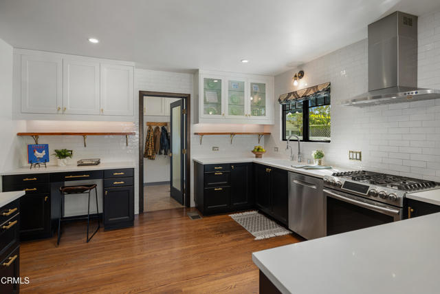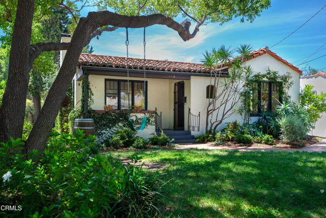 This beautiful three bedroom, two bath 1,454 square foot (as measured) Spanish, with an enchanting one bedroom, one bath, 356 square foot (as measured) accessory structure is absolutely picture-perfect. You enter the romantic residence via a welcoming front porch that steps into the elegant interior. The gorgeous living room features hardwood floors and a central decorative fireplace, flanked by custom rich wood, glass-fronted cabinetry that beckons you in. Additionally, there is an inviting formal dining room wrapped in windows that adjoins the impeccably remodeled kitchen with stainless steel appliances, an expansive peninsula with bar seating, quartzite counters, as well as a built-in desk or workspace. There are three bedrooms with plenty of storage, as well as two magazine-worthy renovated bathrooms. The back accessory structure has one bedroom, one bath, and a kitchenette. It has limitless possibilities and could be a fantastic office, guest abode, or entertainer's cabana as it is sited right off the pool. Other highlights at the property include designer fixtures, coved ceilings, arched doorways, gleaming hardware, and sumptuous marble tile. The home, which has incredible curb appeal, sits on a verdant 8,208 square foot lot filled with an abundance of blooming blossoms as well as native plants. It has a flower-lined front path surrounding the lush lawn that leads you to the gracious raised porch. The backyard, with a glistening pool, is a paradise that showcases the best of the California lifestyle. There are numerous spaces for relaxing beneath the stars, quiet reflection, or creating an idyllic environment to host the ultimate celebration under the elongated pergola. This is truly a wonderful place to live. Don't miss this shining jewel in our sought-after Pasadena community.