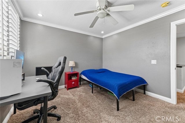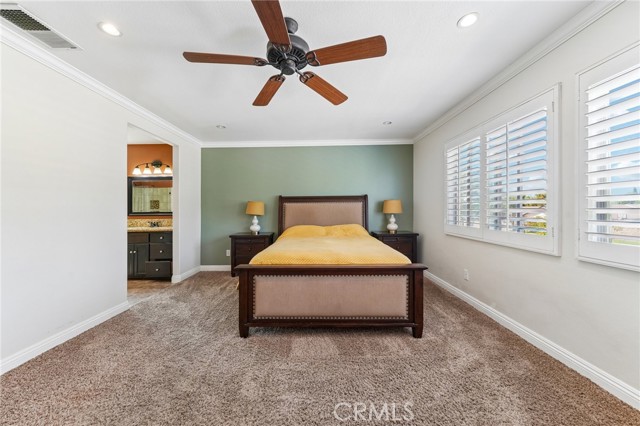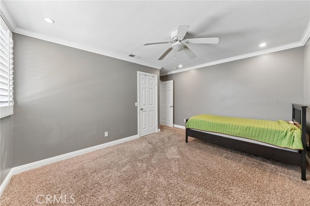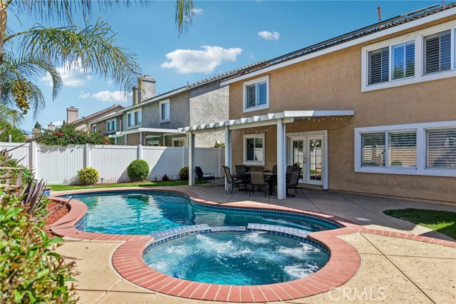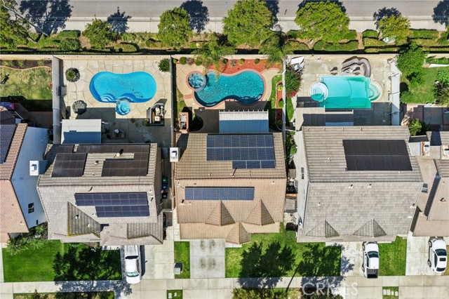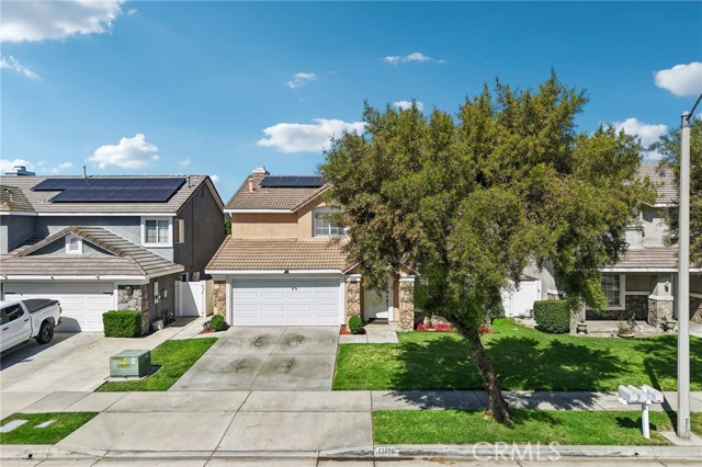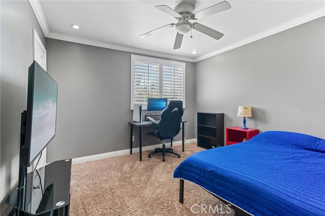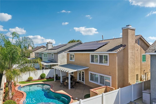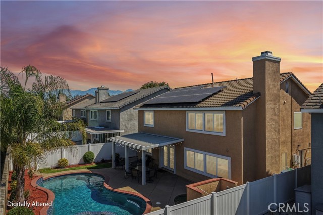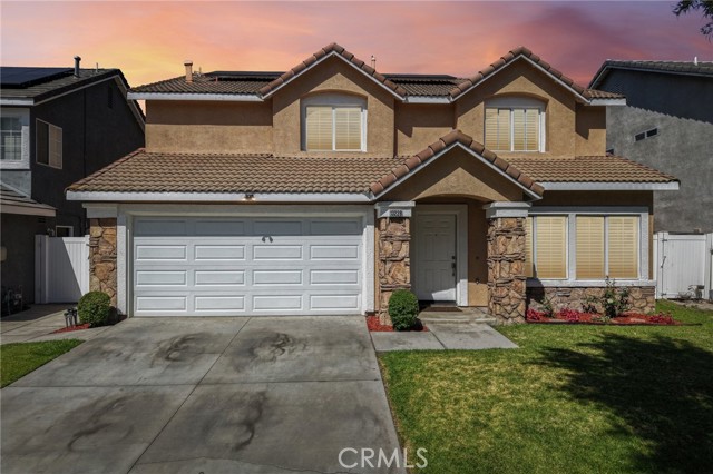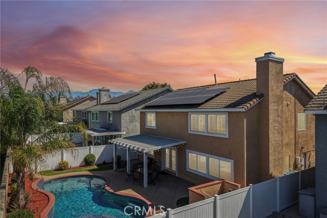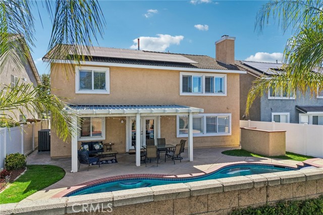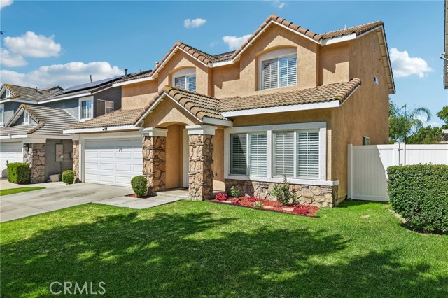 Move-in ready 4-bedroom, 2.5-bath home featuring shutters throughout, custom crown molding, and upgraded baseboards. The backyard is beautifully designed for entertaining, offering the perfect space for gatherings and relaxation. This home includes a newer HVAC system, newer water heater, fresh exterior paint, and a newer garage door with opener. Solar is also included for added energy efficiency. Conveniently located near freeways, schools, and shopping, this home combines comfort, style, and accessibility.