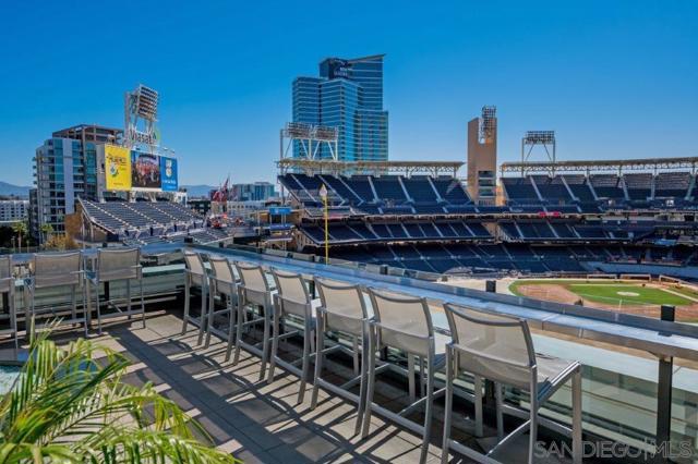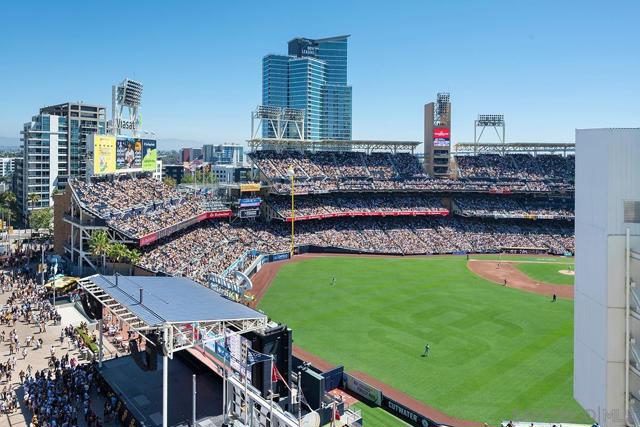 This 10th floor 2 bedroom/2 bath condo at The Legend is a homerun; captivating views directly into San Diego’s famed Petco Park! First time ever offered for sale by the original owner, enjoy baseball games and open-air concerts right from your living room or your spacious balcony – or from the incredible 7th floor ‘Club Legend’ deck. Great natural light from expansive windows, new paint and carpet, a split-bedroom floor plan ideal for privacy, and an open-concept granite and stainless kitchen. Complete with a parking space near the elevator and private storage just steps from your front door. First of this floor plan to hit the market in 6 years! See supplement for more details. The gourmet kitchen is a chef's dream, showcasing stainless appliances, granite countertops, European-style cabinetry, and an inviting eat-at bar illuminated by elegant pendant lighting. Floor-to-ceiling windows not only flood the condo with natural light but also offer breathtaking, unobstructed views of Petco Park and Gallagher Square. The split-bedroom floor plan is perfect for privacy for roommates or guests. The primary bedroom suite doesn’t skimp on views either. The ensuite bathroom features a dual vanity, tasteful custom tile backsplash, and frameless glass-enclosed shower. The Legend is the only residential high-rise to be built inside the gates of our Major League Ballpark & the only residential tower to be built on the 3-acre Park at the Park / Gallagher Square! This iconic building overlooking the Padres ballpark (voted the best ballpark in America) will be treasured for generations with historic detailing preserved by Bosa Development to create a world-class residential tower. The Legend is centrally located just a few blocks from the Gaslamp Quarter & Marina District for convenient access to endless shopping & dining options. The Legend’s amenities include a 2nd floor rooftop deck looking out over Park at the Park complete with pool & spa, fully equipped fitness room, roof garden, barbeque area, steam, sauna, and changing rooms. Entertain guests in ‘Club Legend’, the 7th-floor social lounge featuring a sprawling rooftop terrace with panoramic Petco Park views and a cozy outdoor fireplace lounge and outdoor kitchen. Additional conveniences include guest parking reservations via mobile app, 24-hour concierge and security services, and plans for EV charging stations within the secured garage. Previous builder documents cited 972 sq .ft., assessor records now indicate 888 sq. ft. VA Approved (000017) & FHA Approved(S007729)!