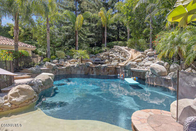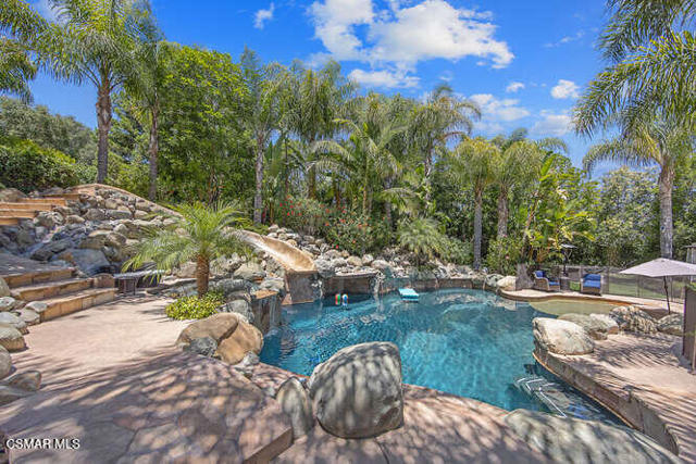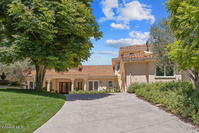 Beautifully appointed custom 6498 Square foot estate on 1.25 acres of park like grounds! This 5BD+8BA include two pirmary suites and is truly a destination location.The ground floor primary suite includes a dual- sided marble fireplace, spa tub, large glass shower, custom designed walk in closet, private patio that leads to the rear grounds. The second private suite includes a wet bar, private terrace with views of the grounds and full marble bathroom retreat along with a huge walk-in closet. This custom home features a gourmet chef kitchen w/ large island, custom cabinetry, gorgeous granite, stunning backsplash, SubZero, Wolf and Cove stainless steel appliances plus butlers pantry w/ warming drawer and wine fridge. Kitchen spills into oversized family room w/ custom cabinets and cozy fireplace. This home features a formal entry w/ stunning views of lush backyard, formal living room, formal dining room, oversized bedrooms.The yard features two built-in BBQ areas, two outdoor televisions, fire pit, putting green, working greenhouse, 4 fountain, 3, indoor fireplaces, sparkling pool with many rock waterfalls, and a huge water slide, spectacular walkways throughout, gorgeous rose garden, and an orchard with orange, lemon, apple, avocado, plum, peach, apricot and lime trees. The stunning guest house includes newer tile flooring, custom window coverings, a kitchenette and so much more.This is the haven you are looking for.