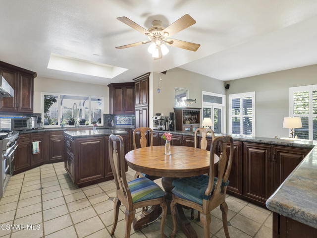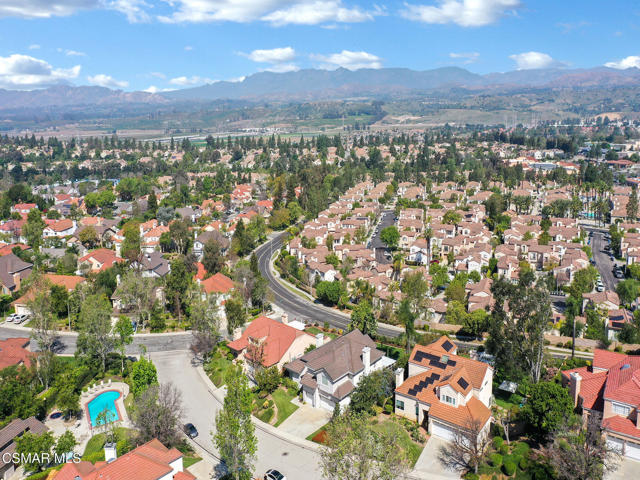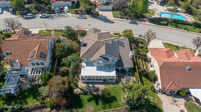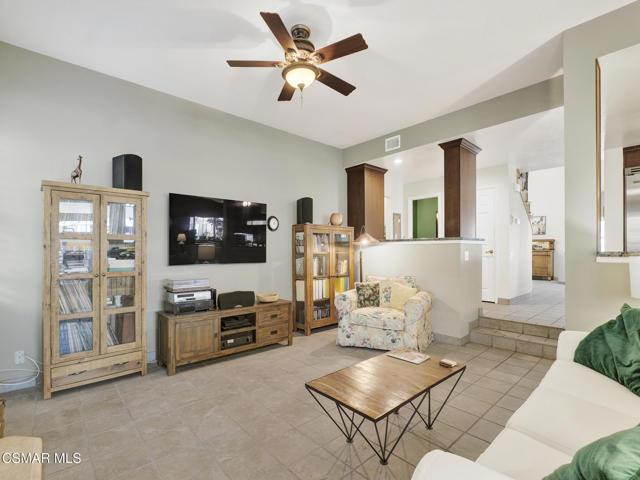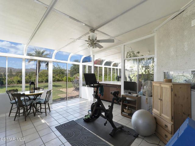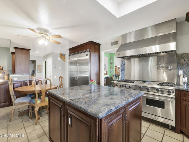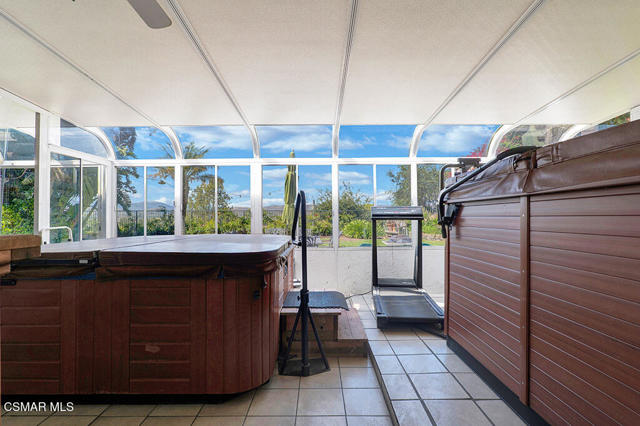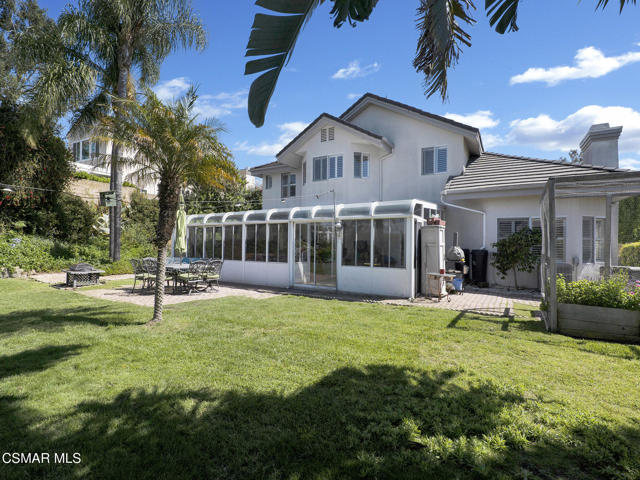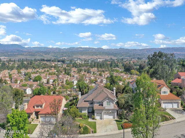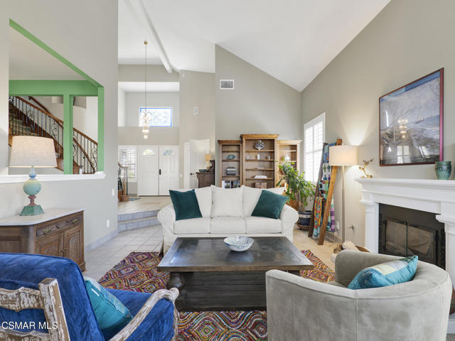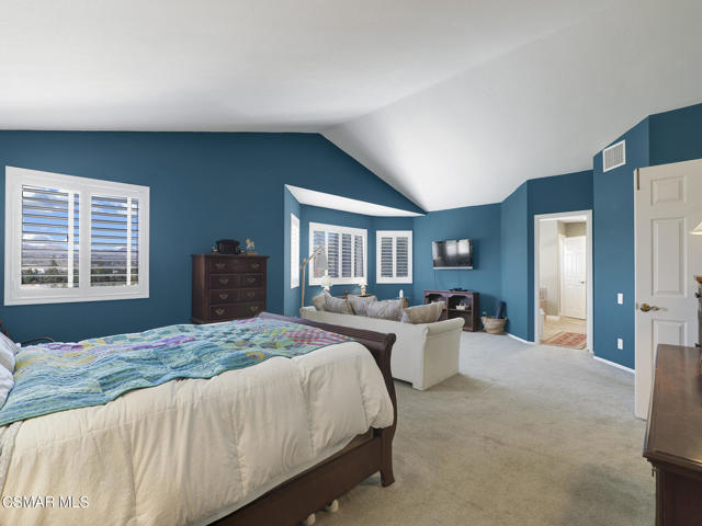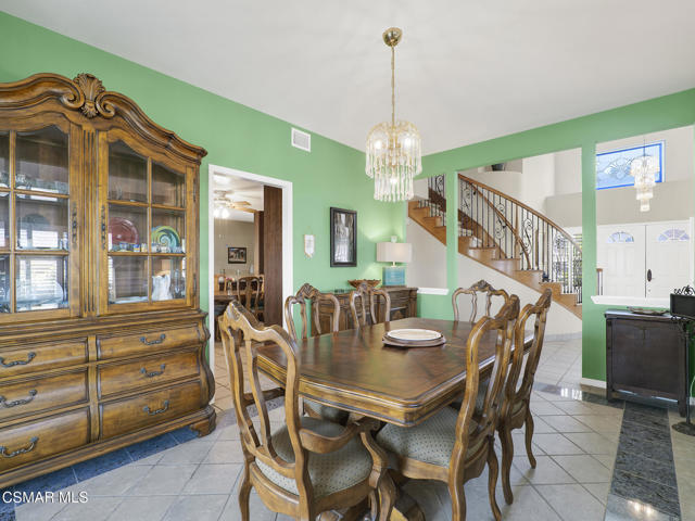 Set within the Buttercreek Estates neighborhood in Moorpark's desirable Mountain Meadows area, this 2-story home offers 5 bedrooms, 4.5 bathrooms, 3,603 sq. ft. of living space on a 13,155 sq. ft. lot, with multiple living areas, a main-level bedroom, and a backyard positioned to showcase views across Moorpark. A landscaped front yard maintained by the HOA, mature rose bushes, and a concrete driveway create a welcoming approach. Double entry doors are framed by a stained-glass window above and a side window, opening to Italian tile flooring with a decorative inlay at the entry, while Italian tile continues through most of the downstairs. Just off the entry, a secondary bedroom with mirrored closet doors and access to a full bathroom offers flexibility for guests, multi-generational living, or a home office. Living and dining areas feature vaulted ceilings, a white gas fireplace, and windows that bring in natural light and backyard views. Italia Murano glass chandeliers are featured at both the entry and dining area, where a half wall defines the dining space with Italian tile flooring, marble inlay, and French doors connecting to the sunroom. Granite countertops and a center island--offering generous storage and a slide-out spice rack--anchor the kitchen, while an L-shaped counter defines the dining nook with a lighted ceiling fan. Separate built-in Viking refrigerator and freezer units sit side-by-side, along with a Viking 6-burner range plus a built-in griddle, double oven, pot filler, built-in ice maker, and newer dishwasher. A farmhouse-style stone sink is positioned beneath windows with stained glass accents on each side, overlooking the sunroom and backyard. A separate prep area includes a slide-out spice rack, a stainless sink, and etched glass cabinetry. Open to the kitchen, the family room features high ceilings, a lighted ceiling fan, and a stone fireplace with a detailed mantle. French doors lead into the fully enclosed sunroom, where tile flooring, surrounding windows, and multiple sliders bring in natural light and connect to the backyard--well-suited for a home gym, office, or additional living space. The sunroom is not included in the listed square footage, yet adds meaningful versatility to the home. Views across Moorpark and the wide-reaching Topatopa Mountains define the backyard setting--also enjoyed from the kitchen sink, offering a peaceful start to the day as the morning sun rises over the hills. Iron fencing lines the rear, with block walls on the sides for added privacy. A covered BBQ area with sink, paver patio, storage shed, and garden boxes are supported by mature landscaping and a 6-zone sprinkler system. Two spa units--one for exercise and one for relaxation--may be included in the sale. Upstairs, a landing connects three secondary bedrooms with mirrored closet doors and lighted ceiling fans. One secondary bedroom includes an en suite bathroom, while the hall bathroom with dual sinks and a tub/shower combination serves the remaining two bedrooms. The primary suite offers a double door entry, sitting area, pitched ceiling, and multiple windows. The en suite bathroom includes a granite vanity with makeup station, soaking tub, glass-enclosed shower, private toilet area, and a walk-in closet. All bathrooms throughout the home have been custom designed. Additional features include paid solar, a tankless water heater, plantation shutters, water filtration system, dual-pane windows with grids, wired for an alarm system, and Ring doorbell. The community pool is conveniently located just across the street, along with close proximity to Tierra Rejada Park, Arroyo Vista schools, and local shopping and dining. The HOA includes access to the association pool, spa, clubhouse, and BBQ area, along with front lawn maintenance and water for the front landscaping. This home comes with a fully paid-off solar system -- the sun works for you!