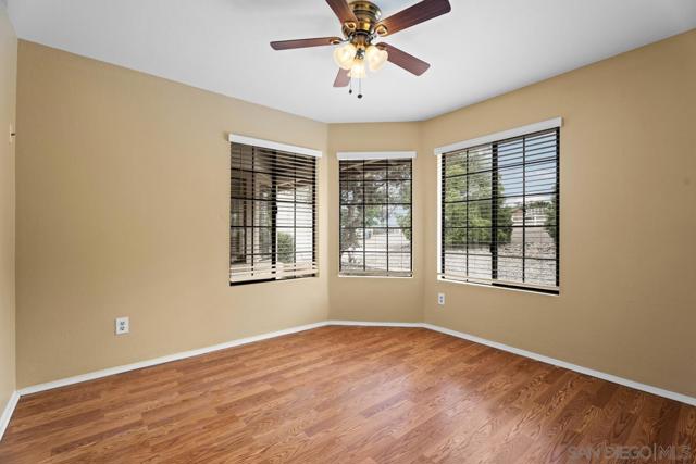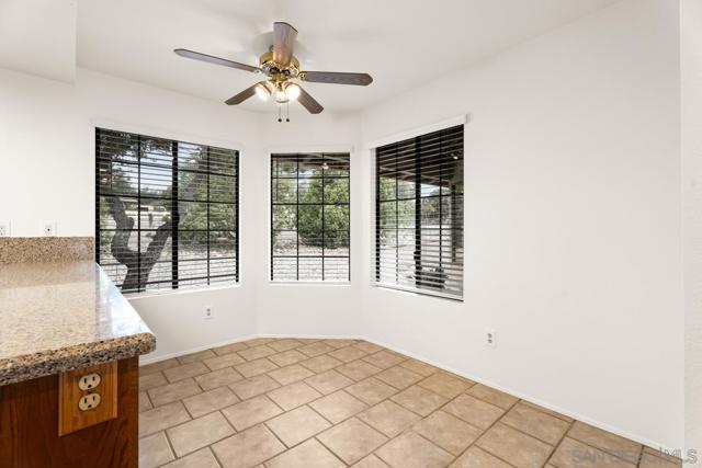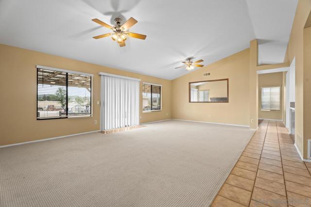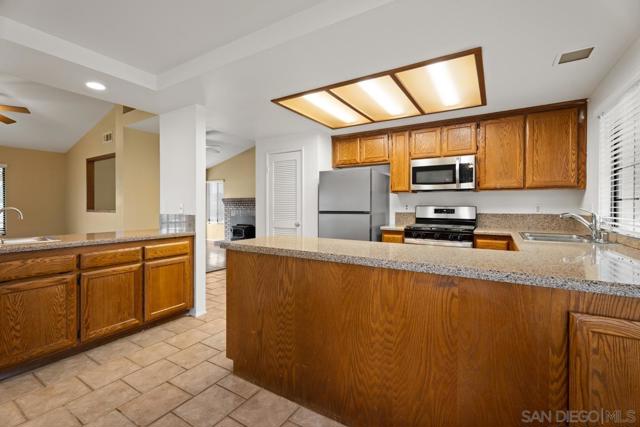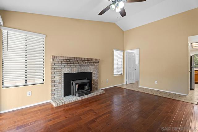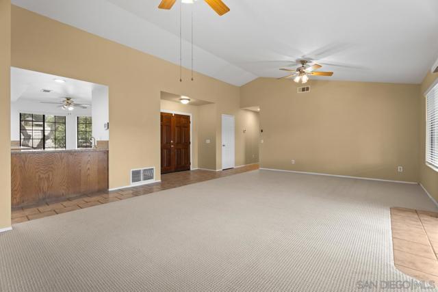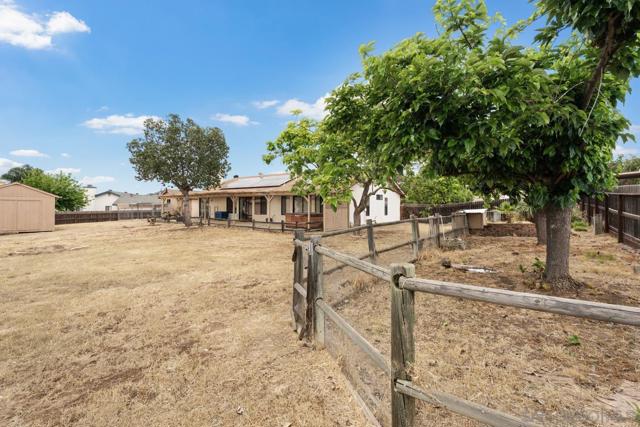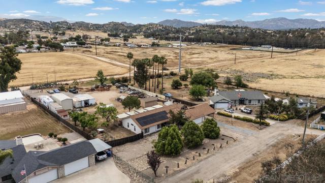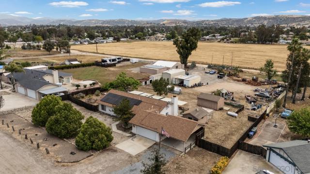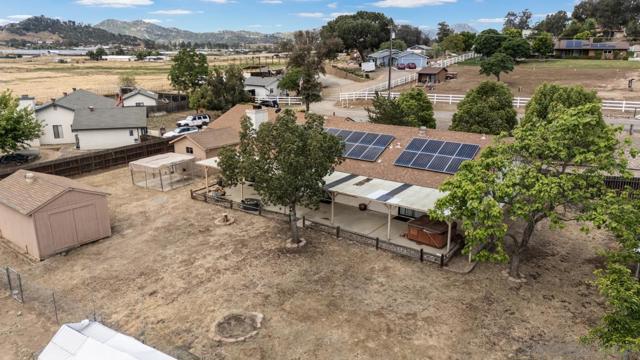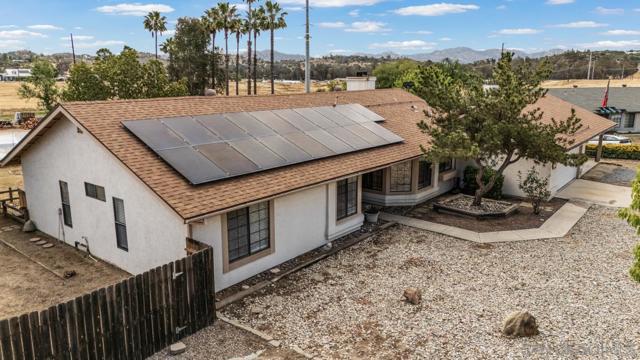 Located in the Heart of Ramona, close to Elementary, Middle and High Schools. This 3 bed, 2 bath country ranch-style home sits on 1.14 level acres with front and rear road access. Solar adds efficiency, and the open layout offers abundant natural light, vaulted ceilings, and ceiling fans throughout, with a spacious living room, formal dining, and a family room with wood-burning stove insert. The kitchen features Corian countertops, an eat-in area, large peninsula, and a second prep sink. New carpet and fresh interior paint make it move-in ready, and both bathrooms include dual sink vanities. The primary suite opens to a private covered patio. This property offers excellent versatility with a garage, carport, detached office with power and A/C, and a separate shop. Additional features include a dog run, RV parking, and usable land. The rear portion of the lot is currently rented, offering optional income potential.