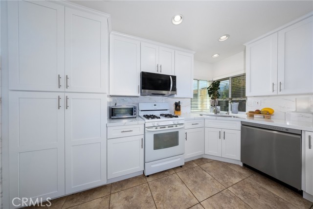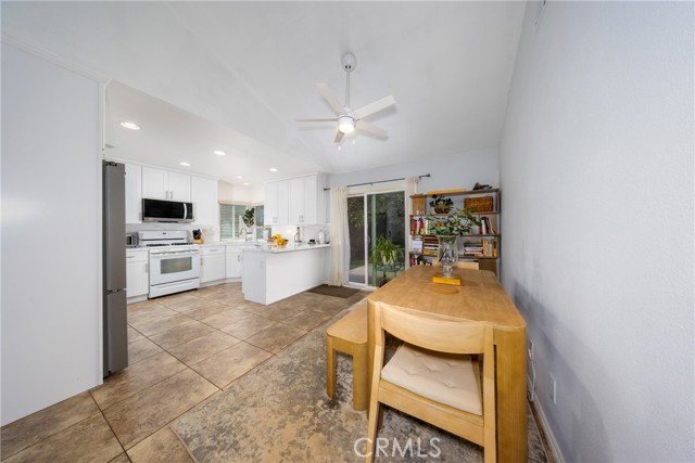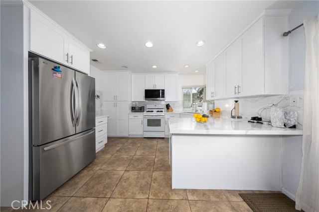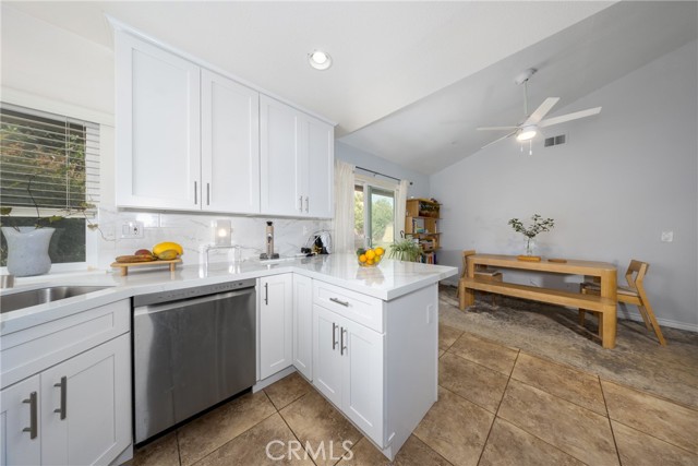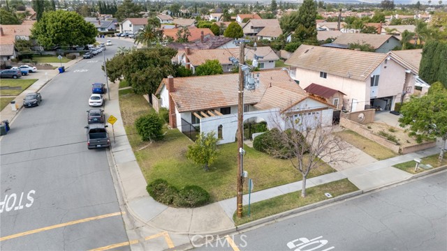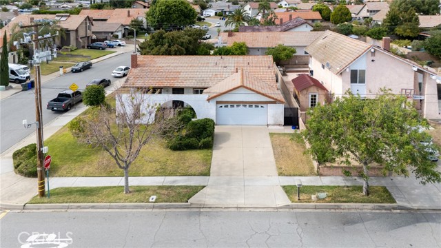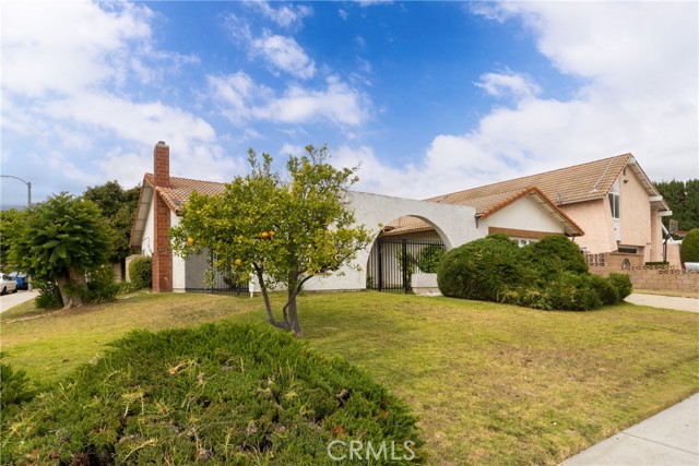 Desirable single-story home on a spacious corner lot, offering 3 bedrooms and 2 bathrooms with a bright, open-concept layout. The inviting living room features soaring ceilings and a cozy fireplace, creating a warm and welcoming ambiance. The upgraded kitchen is beautifully appointed with white quartz countertops, crisp white cabinetry, and both a breakfast bar and a sunny breakfast nook for casual dining. The private owner’s suite includes a sliding glass door with direct backyard access, while the en-suite bathroom features a granite vanity and a walk-in shower. Two additional bedrooms share a full bathroom with granite countertops and a shower/tub combination. Additional conveniences include an interior laundry room, a two-car attached garage, and an extended driveway for ample parking. Step outside to a generous backyard with lush landscaping and mature fruit trees—perfect for entertaining, relaxing, or cultivating your own garden. The gated front yard enhances privacy and offers a charming patio and garden space.