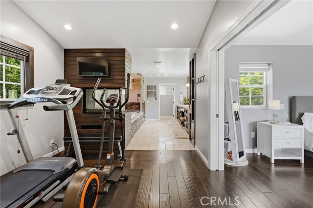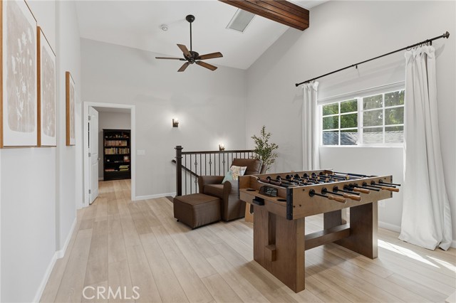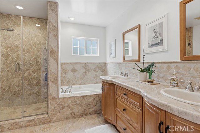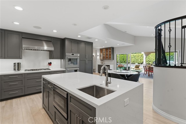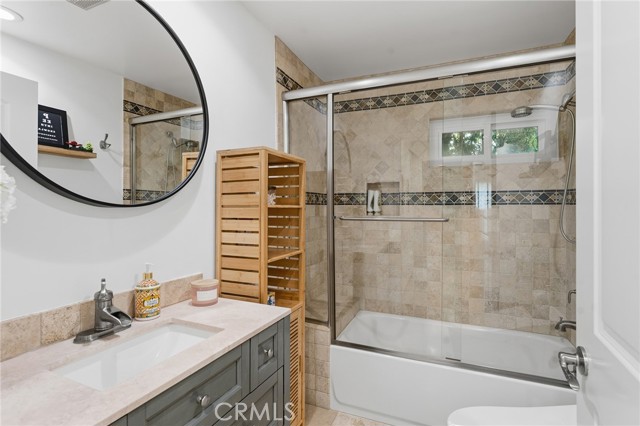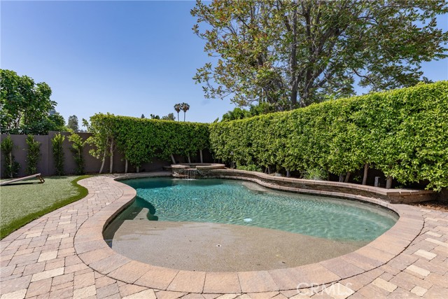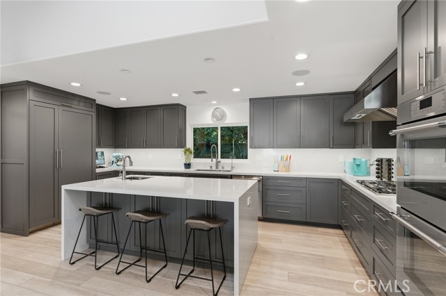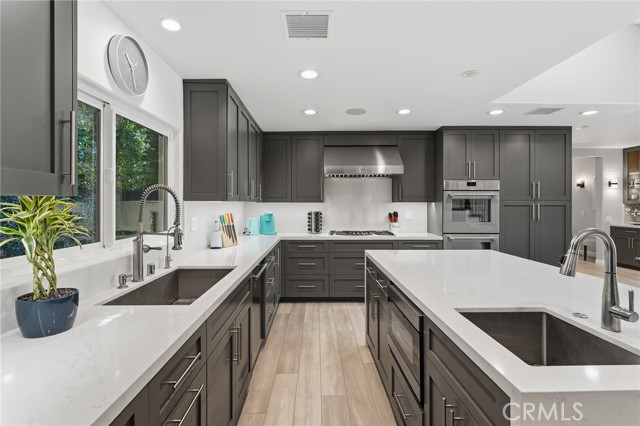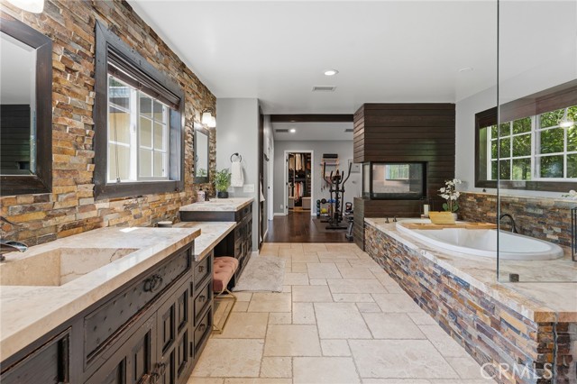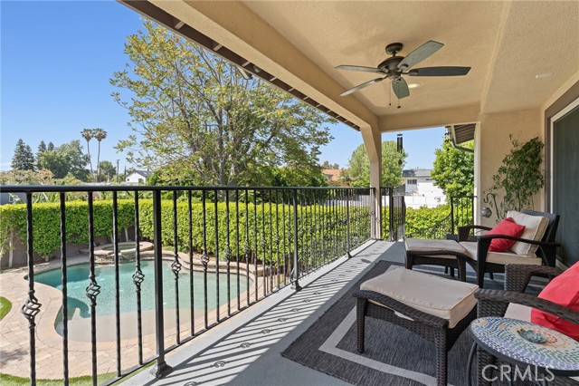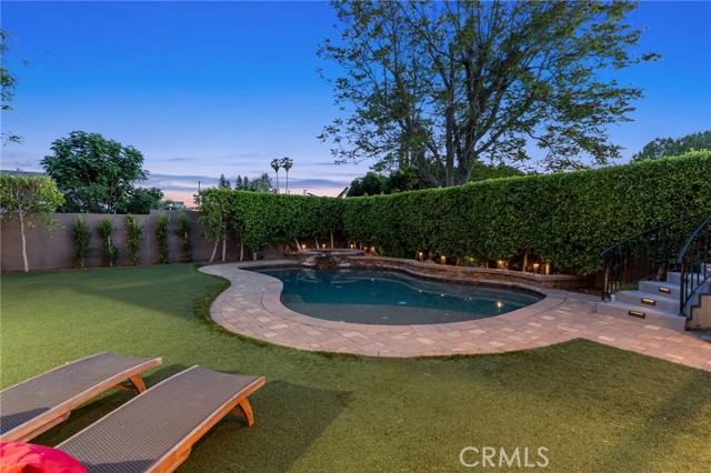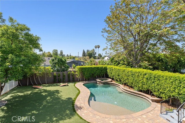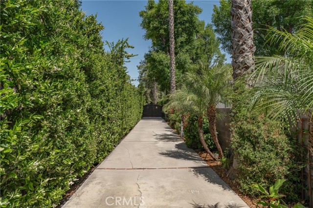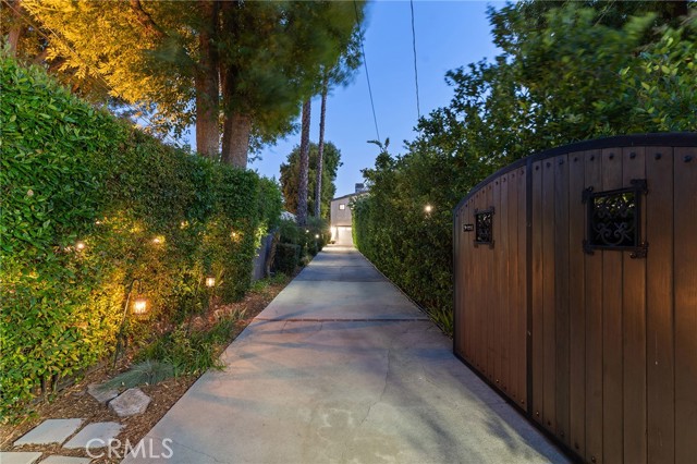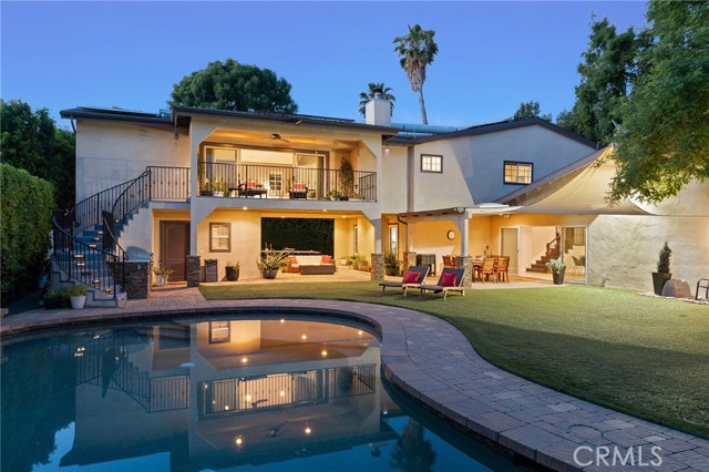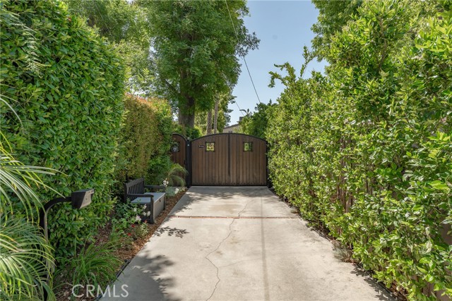 Walnut Acres remodeled estate with 466 SF guest house & incredible entertainer’s backyard situated 140 feet off the street behind an automatic security gate for ultimate privacy & seclusion. A long driveway flanked by mature hedging leads to expansive parking for large gatherings including 2-car attached garage & additional covered parking. Step inside to find an open floor plan flooded with natural light with upgraded flooring throughout. The spacious living room has stacked stone fireplace and wraparound picture windows. Gorgeous completely remodeled kitchen boasts large center island with second prep sink & quartz waterfall counters, stainless Thermador appliances including paneled refrigeration, double ovens & 5-burner cooktop, custom soft close cabinetry with incredible pantry space, & breakfast room with glass sliders that open to the backyard. Separate formal dining room features high vaulted ceiling & bar with display cabinetry, serving counter & fridge. A first floor bedroom is ideal for guests or office space with access to a full bathroom and a large side yard. Upstairs you will find four additional bedrooms, a versatile loft providing the perfect flex space for any need, and a convenient upstairs large laundry room with storage cabinetry. The massive approx. 1,000 SF primary suite has private covered balcony deck overlooking the yard, 2 large cedar-lined walk-in closets, separate sitting room currently used as gym, & luxurious en-suite bathroom with heated floors, fireplace, dual custom stone integrated sink vanities, makeup counter, spa tub, steam shower, & toilet room with bidet. Three upstairs secondary bedrooms each have high vaulted ceilings with custom closets & share two full bathrooms each with dual sinks, tubs, & showers. The expansive backyard is truly a private oasis featuring PebbleTec saltwater pool with baja ledge & waterfall spa, BBQ center, covered paver stone patio for outdoor dining, sprawling lawn for play, and mature landscaping with privacy hedging. The separate 466 SF guest house (included in total SF) has its own address/parking, kitchen, living room, & full bathroom. System upgrades per seller: solar panels for terrific energy savings, newer HVAC & water heater, Milgard windows/slider, security cameras, & speaker system. Adjacent to Westfield Mall/Village, Calabasas Commons, Warner Center with the new Rams Village in development, local parks/hiking trails, & zoned for award-winning El Camino & Hale charter schools.