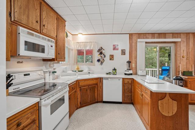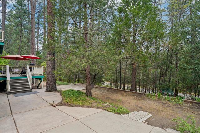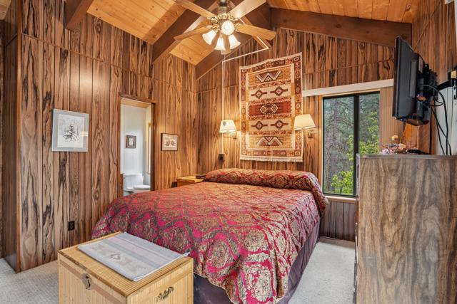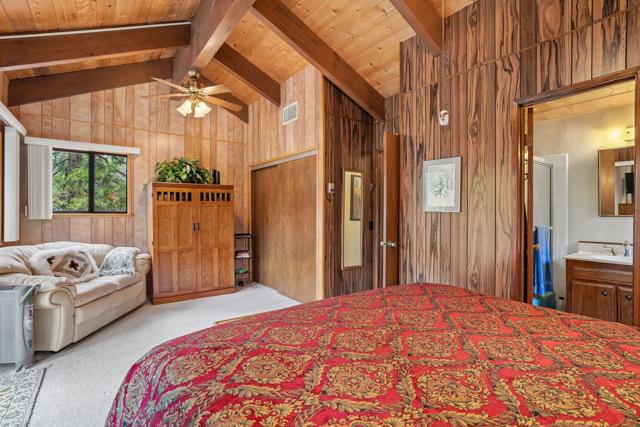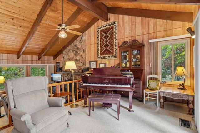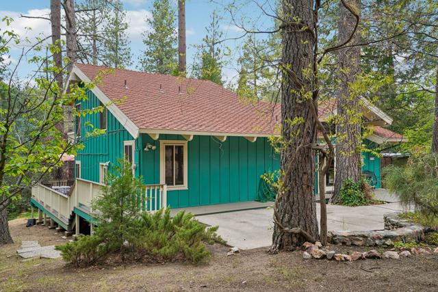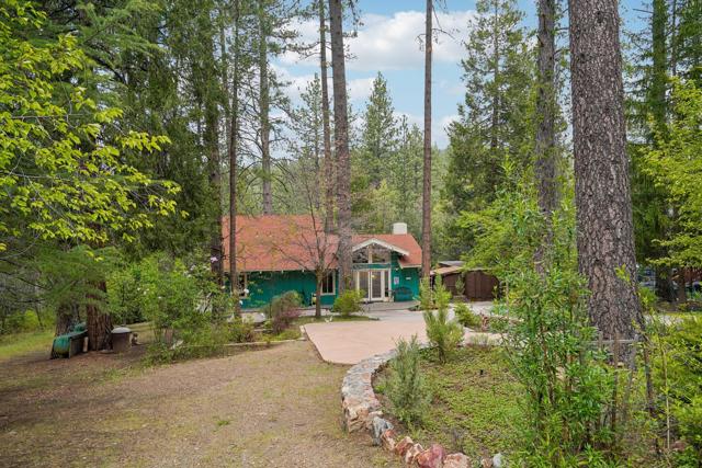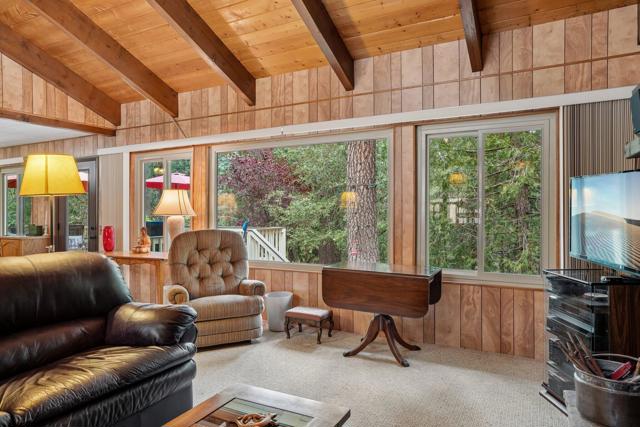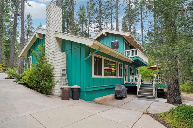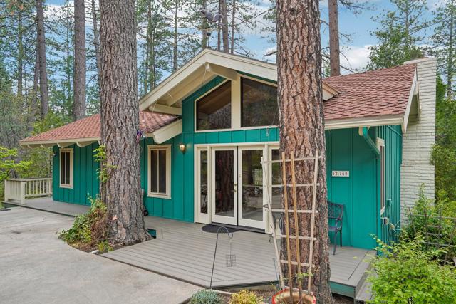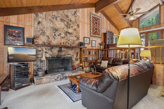 Tucked among the pines, this inviting split-level cabin offers the perfect blend of comfort and mountain charm on a spacious 0.37-acre street-to-street lot. With 1,480 sq ft, the home welcomes you with vaulted ceilings, dual-pane windows, and a stunning rock fireplace that anchors the open living, dining, and kitchen area. Step outside to a wraparound deck and private balcony--ideal for morning coffee or quiet evenings under the pines.The flexible layout features a bedroom and full bath on the lower level, while the private primary suite is tucked upstairs. A bonus living room or sitting area provides the perfect space for guests, a reading nook, or home office. Central heat and convenient laundry hookups off the kitchen add everyday ease.Outdoors, enjoy a circular driveway, EV charging plug, sheds, and a storage container. The property is dotted with 7 fruit trees and supported by sprinkler irrigation. Recent upgrades include a newer roof and hot water heater. Offered mostly furnished, making it easy to settle in and start enjoying right away.A true mountain retreat with space, character, and convenience--schedule your showing today and experience the lifestyle for yourself.
