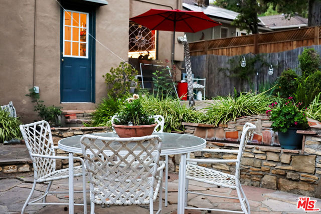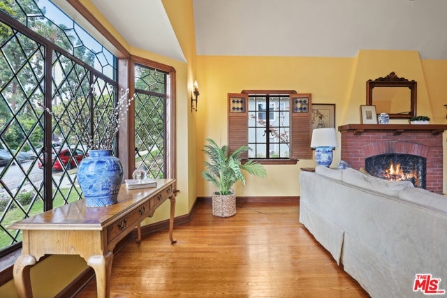 Set in Rossmoyne, this brick Tudor carries the presence and romance of a classic Hancock Park-style residence, with steep gables, leaded glass, arched brickwork, and a porte-cochre creating a memorable arrival from the street. Mature trees and layered garden beds frame the front lawn, while a tucked-away brick patio offers a quiet outdoor room before even entering the home. Inside, the living room is the architectural centerpiece, with a vaulted beamed ceiling, hardwood floors, a brick fireplace, and leaded glass windows that bring in filtered garden light. Arched openings and original wood trim guide the transition through the entry hall, where a period stair and wrought-iron railing add to the home's sense of craftsmanship and age. The formal dining room continues the home's old-world character, with hardwood floors, divided-light windows, and French doors opening to the brick side patio. The kitchen has been updated with rich custom cabinetry, detailed tilework, an AGA range, a hammered copper farmhouse sink, and a stained-glass window over the sink looking out toward the garden. The home offers four bedrooms and three baths, including an upstairs primary suite generously scaled with hardwood floors, arched transitions, and an updated bathroom with a marble-topped vanity, glass-enclosed shower, and stained-glass detail. The upper level carries its own character throughout, with additional bedrooms including one that opens to a window-wrapped sleeping porch with leafy outlooks, while views toward Downtown Los Angeles add to the appeal. The backyard unfolds as a series of garden spaces rather than a single patio, with stone terraces, winding paths, mature trees, planted beds, and intimate areas for dining, lounging, and tending the garden. Rich in Tudor character and unusually layered in both its interiors and grounds, this Rossmoyne home brings together architecture, history, views, and a remarkable garden setting. Just south of Mountain Street, the location places neighborhood favorites including Trader Joe's, Whole Foods, Fish King, and nearby hiking trails moments from home.