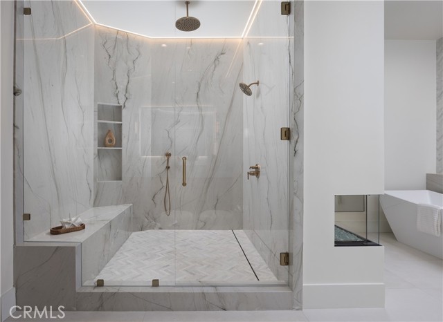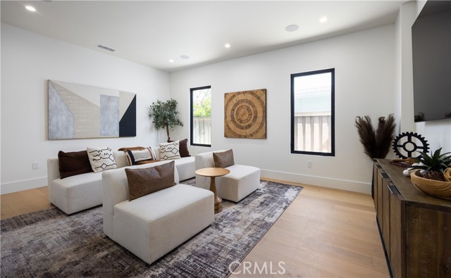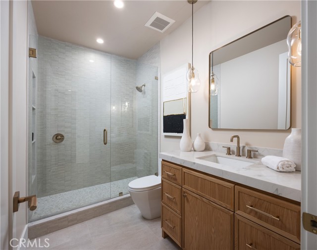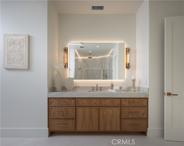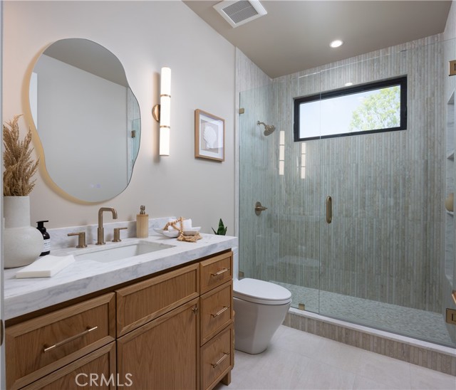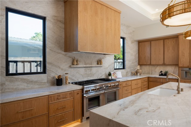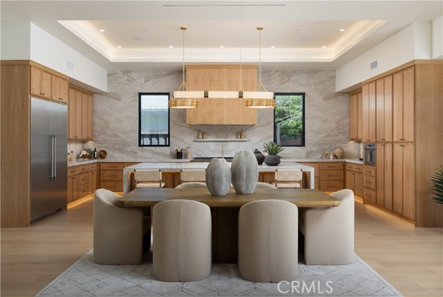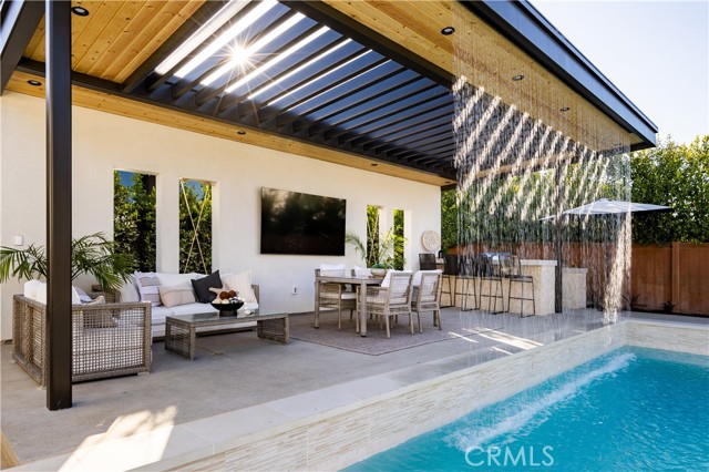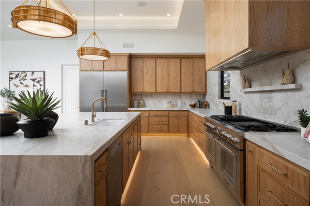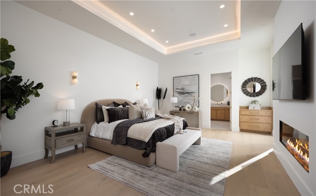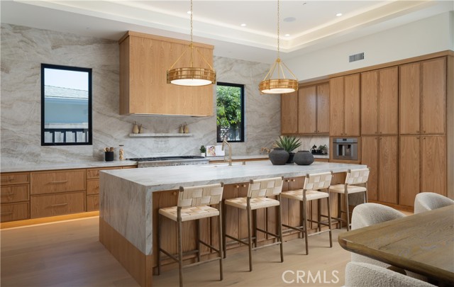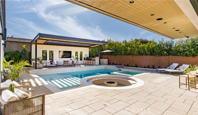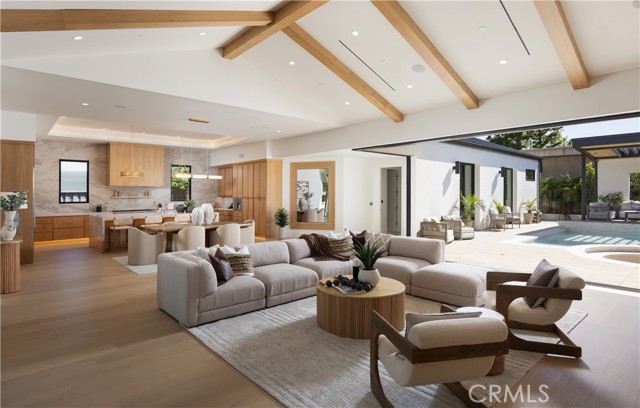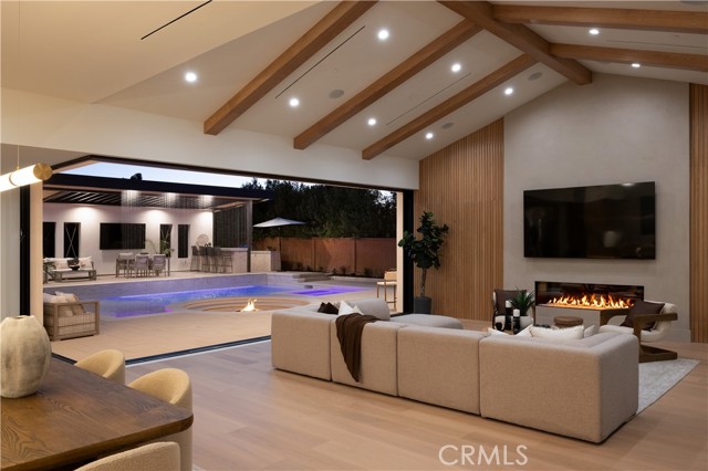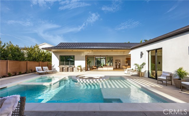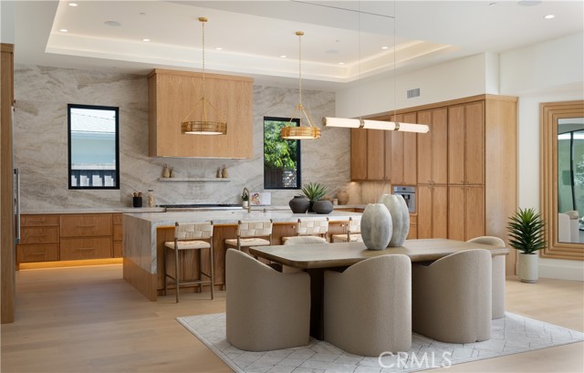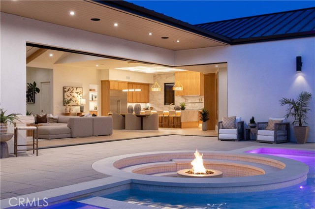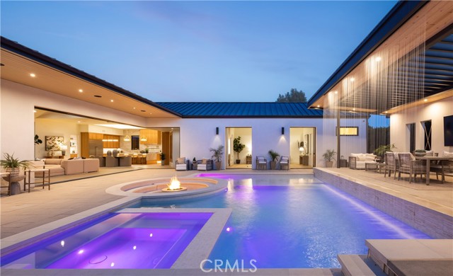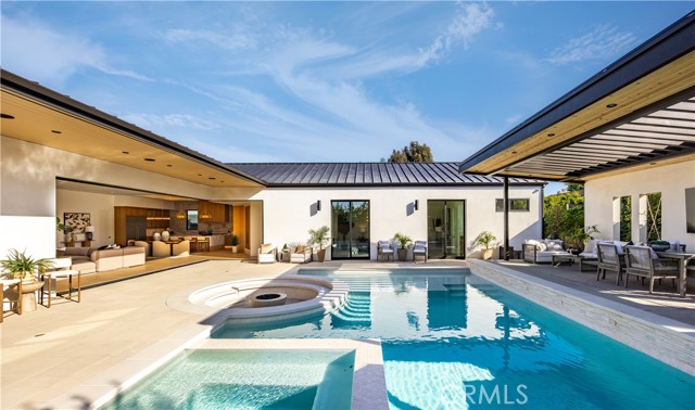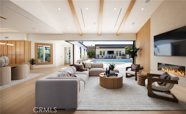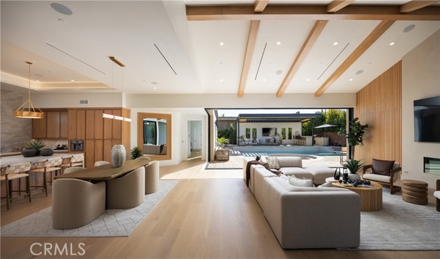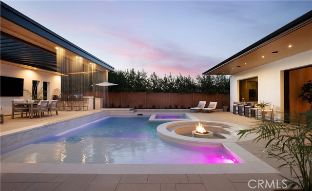 Brand-new in 2026, this architectural single-level estate in Dover Shores offers the rare combination of modern design, expansive scale, and seamless indoor–outdoor living. Privately set on an approximately 13,000 square foot lot, the home spans 5,755 square feet with 5 bedroom suites, 8 bathrooms, and a 3-car garage, blending sophisticated finishes with exceptional comfort. The thoughtfully designed layout is centered around a stunning private courtyard with a mature olive tree, creating a tranquil architectural focal point. Inside, wide-plank white oak floors and soaring 14 foot ceilings enhance the open-concept living spaces. The great room, dining area, and chef’s kitchen open effortlessly to the backyard through massive motorized sliding glass doors, delivering the ultimate indoor–outdoor lifestyle. The designer kitchen features striking quartzite countertops with a waterfall island, custom white oak cabinetry, and Thermador appliances. A fully equipped butler’s kitchen with an additional stove, freezer, and prep sink keeps entertaining effortless while maintaining a pristine main kitchen. Each of the five bedrooms is a private suite with its own ensuite bath and walk-in closet. The primary retreat offers separate his-and-hers bathrooms and walk-in closets, along with a dedicated laundry room for added convenience. Designed for entertaining, a hidden speakeasy-style game room includes a bar island, wine refrigerator, and pass-through window to the backyard. The resort-style backyard is equally impressive with a pool, spa, sunken firepit lounge, built-in BBQ, and covered patio with a dramatic waterfall feature cascading into the pool, creating a serene outdoor retreat. A Savant smart home system seamlessly controls lighting, music, security cameras, and motorized doors throughout the home. Offering a rare single-story layout, bespoke finishes, and resort-caliber amenities, 1453 Galaxy Drive represents an exceptional opportunity to own a newly built luxury residence in one of Newport Beach’s most desirable neighborhoods.