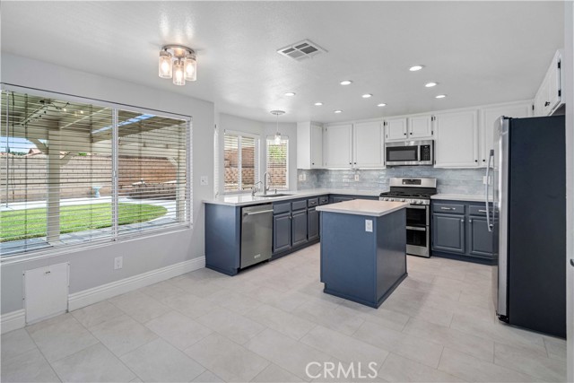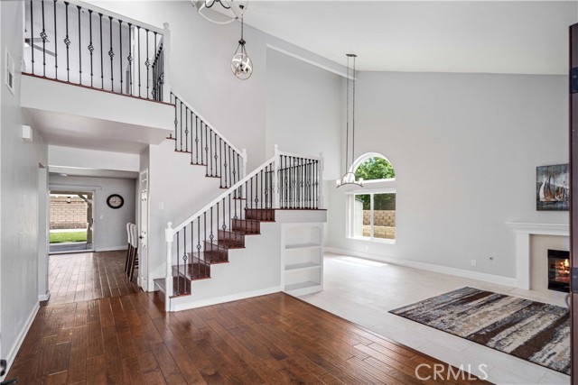 Stunning, Move-In Ready 5 Bed 3 Bath West Palmdale Home w/No HOA & No Mello-Roos! This beautiful 2,839sqft home is located on the end of a quiet cul de sac, bursting with picturesque curb appeal and charm with colored stamped concrete, Slaton Random paving stones, flowerbeds with cheerful rose bushes, shrubs and commercial grade flagpole. Entering the home, you are greeted with soaring ceilings, crisp natural light and beautiful details including the lovely wrought iron balusters, stunning engineered wood flooring and built-in bookcase/shelving. To the left of the entry, inconspicuous access to the 2 downstairs bedrooms, full bath and large laundry room. To the right, a spacious living area with a gas fireplace and easy flow to the adjacent dining area, making it a great entertaining space. Moving through the dining room, you will find a tranquil kitchen that includes Quartz counters, stainless steel appliances, ample storage, a large bay window over the sink and walk-in pantry. A granite wet bar alongside the spacious family room adds to the exceptional entertainment appeal. Upstairs you will find the large Primary Suite that Features 2 Walk-In Closets, A Separate Tub & Shower & Dual Vanities. Rounding out the upstairs are 2 additional bedrooms and a well appointed bathroom. Outside, the 3-car garage offers great storage in an attic space above and has a rear 9-foot-wide pull through garage door for backyard access. The backyard includes a large covered patio area, ample open space w/stamped concrete and pavers, plus 2-tiered Sandstone concrete block wall garden planted with producing fruit trees. This home offers charm, elegance and an excellent layout for a large family and entertaining! Book your showing today and start envisioning your life in this lovely home and community.